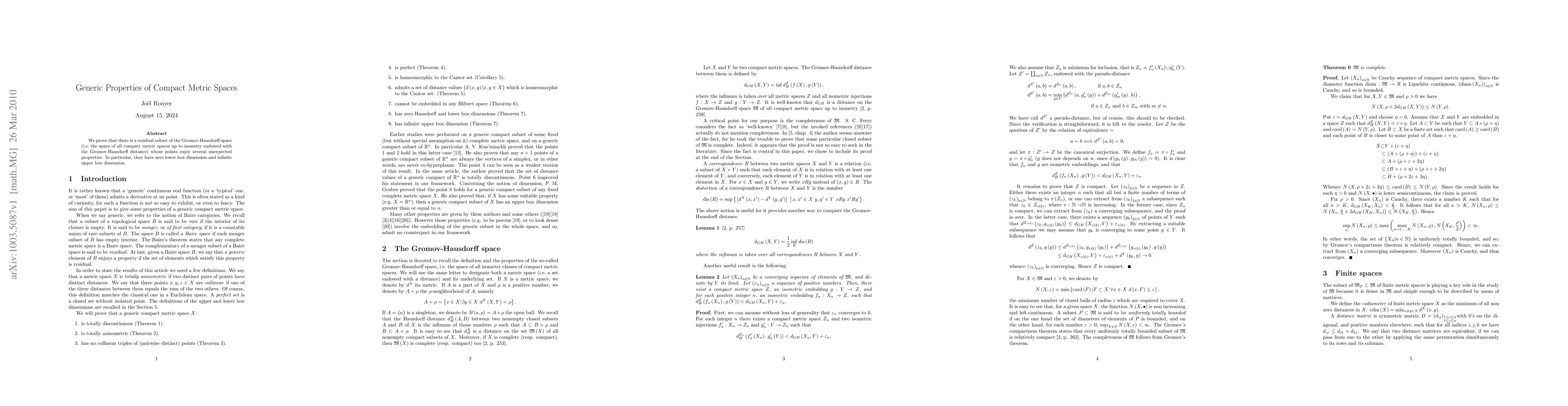 Researchers discovered a subset of compact metric spaces with unique properties, including zero lower box dimension and infinite upper box dimension, in the Gromov-Hausdorff space.