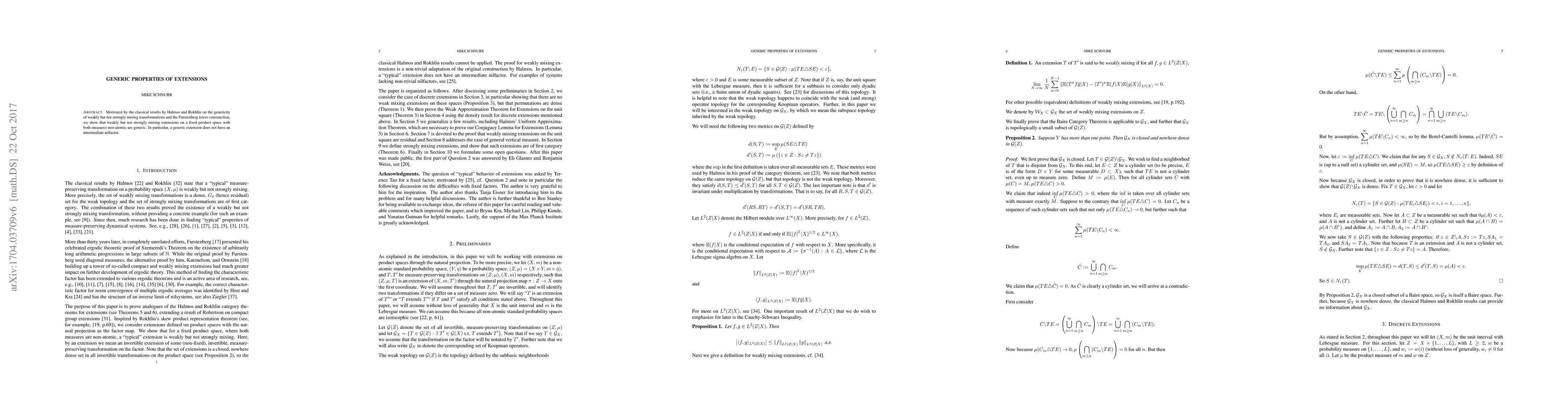 Motivated by the classical results by Halmos and Rokhlin on the genericity of weakly but not strongly mixing transformations and the Furstenberg tower construction, we show that weakly but not strongly mixing extensions on a fixed product space with both measures non-atomic are generic. In particular, a generic extension does not have an intermediate nilfactor.