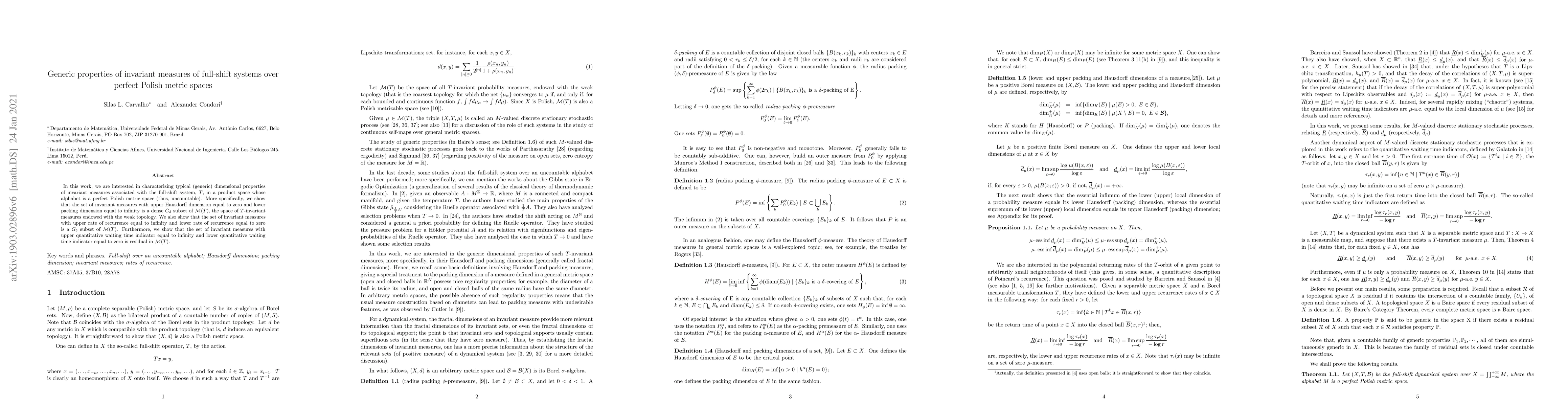 This paper characterizes the typical dimensional properties of invariant measures in full-shift systems over perfect separable metric spaces. It demonstrates that certain sets of invariant measures, defined by specific dimensional and recurrence criteria, are dense $G_\delta$ and residual subsets within the space of $T$-invariant measures.