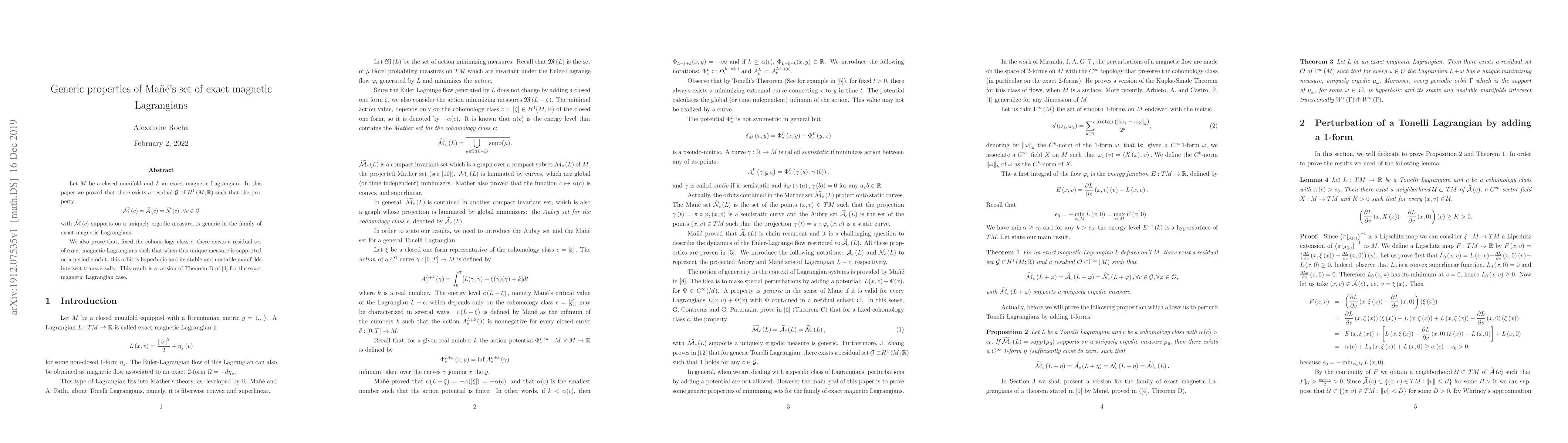 The paper establishes generic properties of Mañé's set of exact magnetic Lagrangians, demonstrating the existence of a residual set where the minimizing measure is uniquely ergodic and supported on a hyperbolic periodic orbit with transverse stable and unstable manifolds.