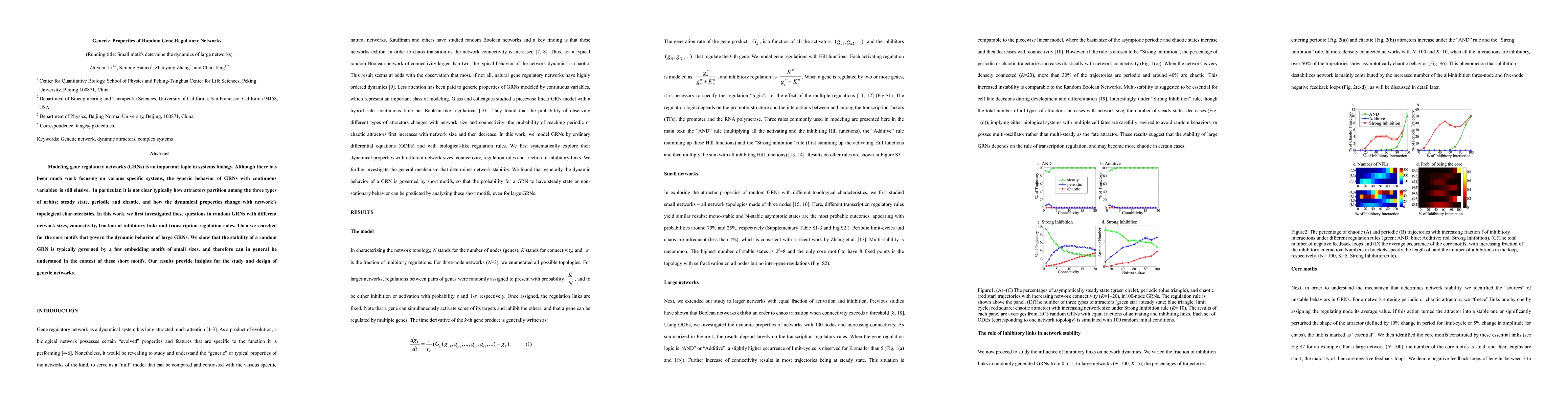 This paper investigates the generic properties of random gene regulatory networks (GRNs) to understand how attractors partition among different types of orbits and how dynamical properties relate to network topology. It identifies core motifs that govern the stability of large GRNs, revealing that small embedding motifs largely determine their behavior.