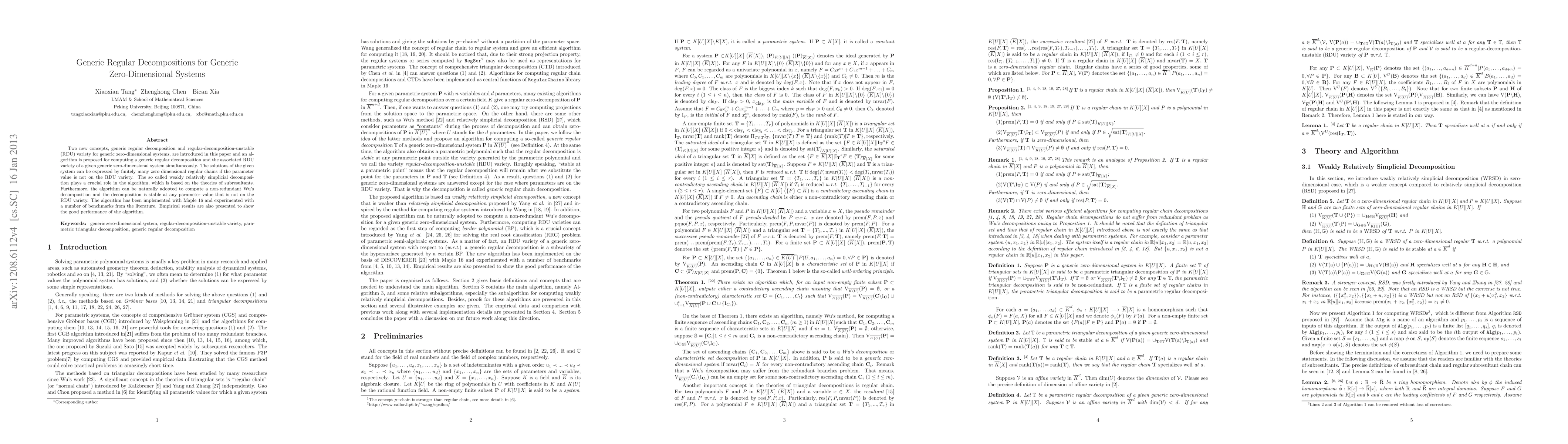 This paper introduces new concepts for generic zero-dimensional systems, including generic regular decomposition and regular-decomposition-unstable (RDU) variety, and proposes an algorithm to compute both simultaneously. The algorithm leverages weakly relatively simplicial decomposition and subresultant chains, and has been implemented in Maple 15 with promising empirical results.