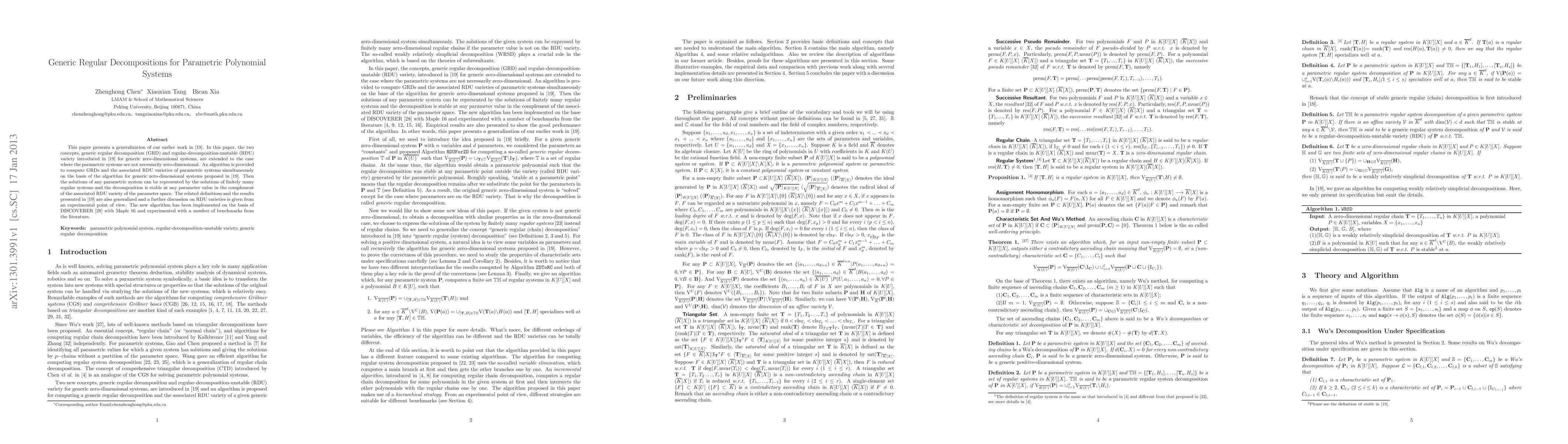 This paper presents a generalization of our earlier work in [19]. In this paper, the two concepts, generic regular decomposition (GRD) and regular-decomposition-unstable (RDU) variety introduced in [19] for generic zero-dimensional systems, are extended to the case where the parametric systems are not necessarily zero-dimensional. An algorithm is provided to compute GRDs and the associated RDU varieties of parametric systems simultaneously on the basis of the algorithm for generic zero-dimensional systems proposed in [19]. Then the solutions of any parametric system can be represented by the solutions of finitely many regular systems and the decomposition is stable at any parameter value in the complement of the associated RDU variety of the parameter space. The related definitions and the results presented in [19] are also generalized and a further discussion on RDU varieties is given from an experimental point of view. The new algorithm has been implemented on the basis of DISCOVERER with Maple 16 and experimented with a number of benchmarks from the literature.