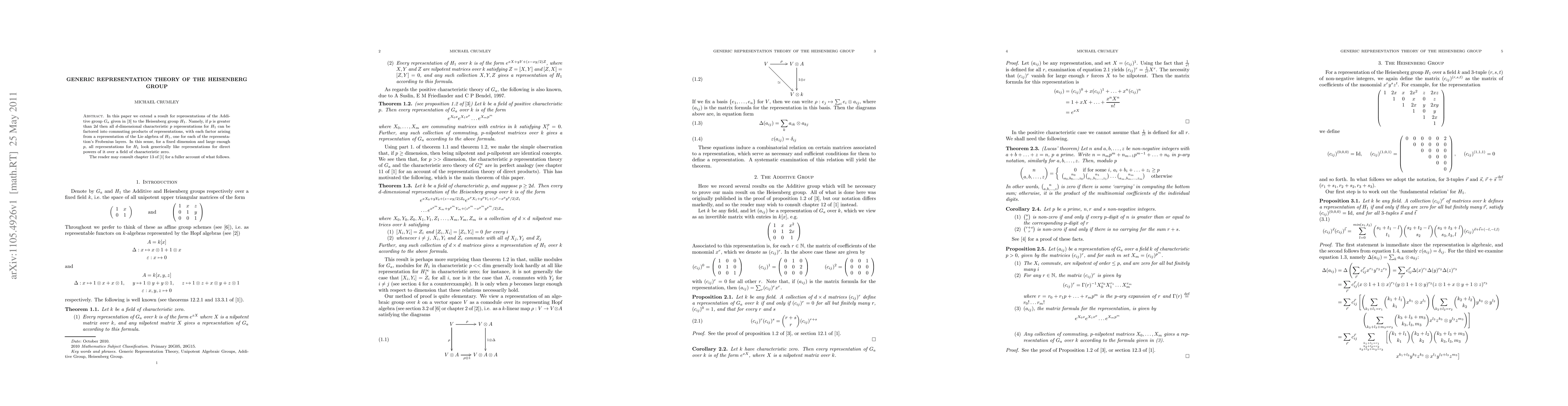 In this paper we extend a result for representations of the Additive group $G_a$ given in [3] to the Heisenberg group $H_1$. Namely, if $p$ is greater than 2d then all $d$-dimensional characteristic $p$ representations for $H_1$ can be factored into commuting products of representations, with each factor arising from a representation of the Lie algebra of $H_1$, one for each of the the representation's Frobenius layers. In this sense, for a fixed dimension and large enough $p$, all representations for $H_1$ look generically like representations for direct powers of it over a field of characteristic zero. The reader may consult chapter 13 of [1] for a fuller account of what follows.
