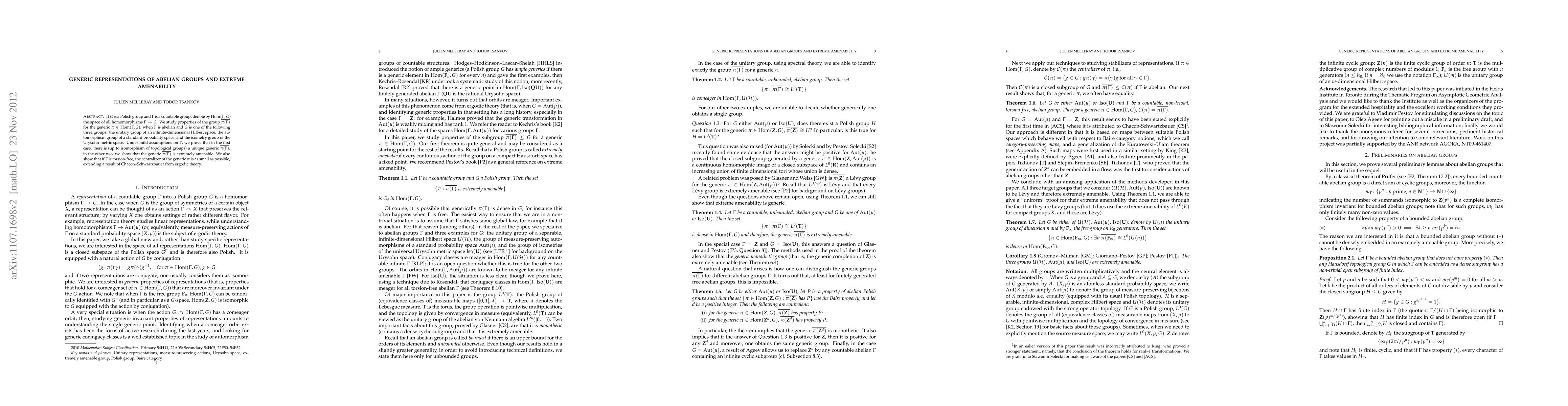 This paper investigates the properties of the closure of the image of generic homomorphisms from countable abelian groups into three specific Polish groups, proving uniqueness in the first case and extreme amenability in the other two, while also addressing the centralizer size for torsion-free groups.