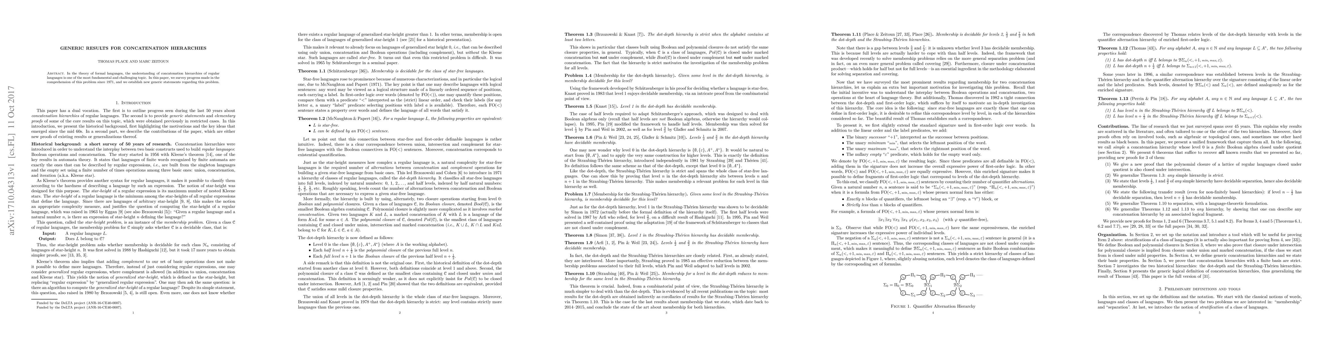In the theory of formal languages, the understanding of concatenation hierarchies of regular languages is one of the most fundamental and challenging topic. In this paper, we survey progress made in the comprehension of this problem since 1971, and we establish new generic statements regarding this problem.