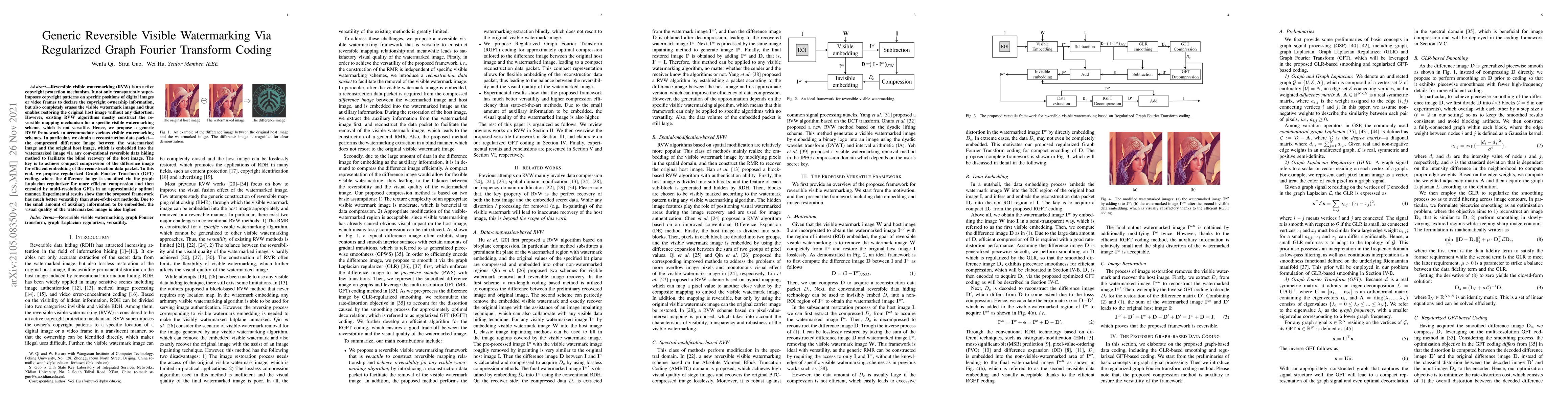 This paper proposes a generic reversible visible watermarking framework using regularized Graph Fourier Transform coding, allowing for efficient compression of difference images and high visual quality watermarked images with versatile embedding capabilities.