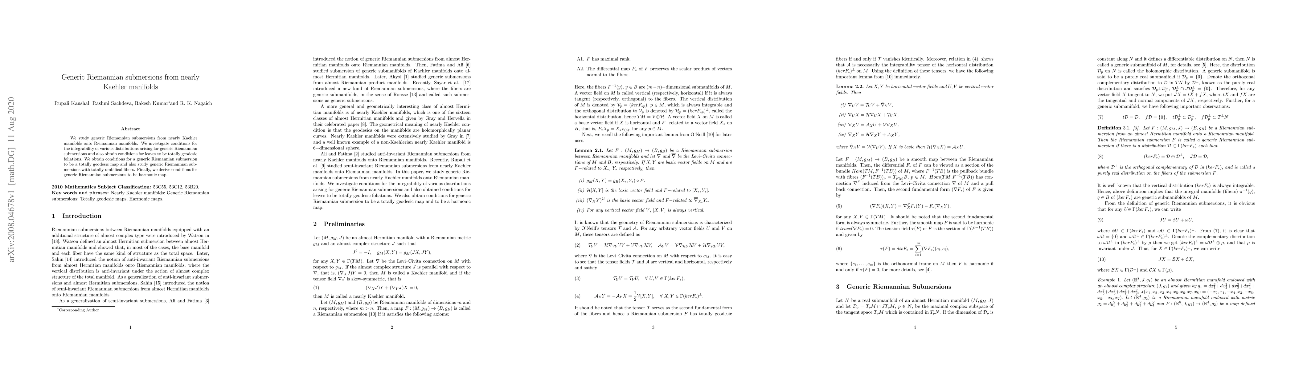We study generic Riemannian submersions from nearly Kaehler manifolds onto Riemannian manifolds. We investigate conditions for the integrability of various distributions arising for generic Riemannian submersions and also obtain conditions for leaves to be totally geodesic foliations. We obtain conditions for a generic Riemannian submersion to be a totally geodesic map and also study generic Riemannian submersions with totally umbilical fibers. Finally, we derive conditions for generic Riemannian submersions to be harmonic map.