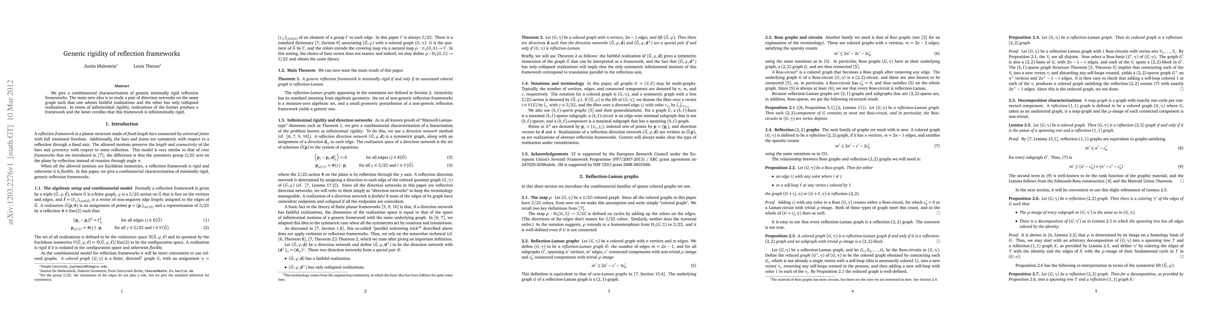 This paper characterizes generic minimally rigid reflection frameworks through a combinatorial approach, utilizing direction networks on the same graph where one network allows faithful realizations and the other only collapsed realizations to certify infinitesimal rigidity.