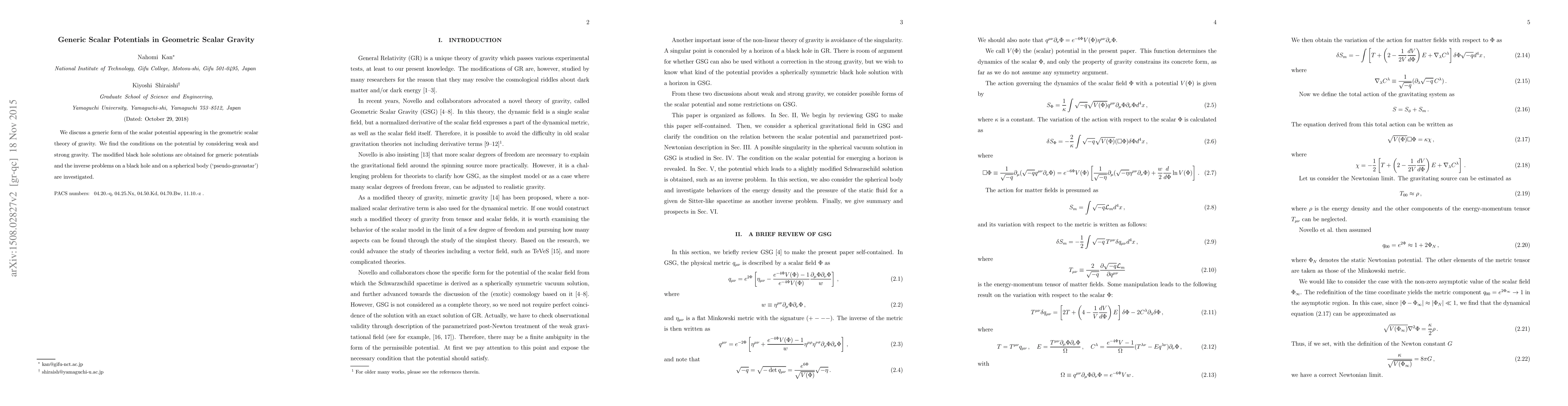 We discuss a generic form of the scalar potential appearing in the geometric scalar theory of gravity. We find the conditions on the potential by considering weak and strong gravity. The modified black hole solutions are obtained for generic potentials and the inverse problems on a black hole and on a spherical body (`pseudo-gravastar') are investigated.