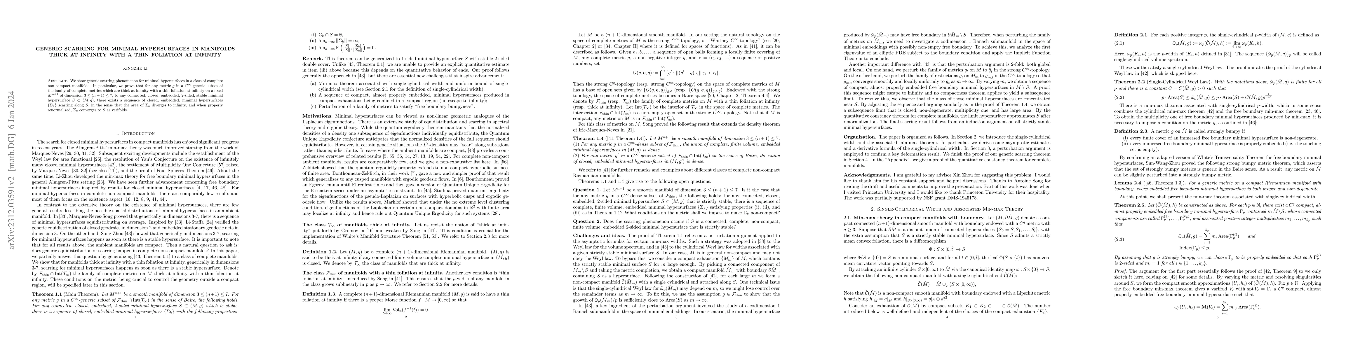 This paper demonstrates the generic scarring phenomenon for minimal hypersurfaces in complete non-compact manifolds that are thick at infinity with a thin foliation at infinity. It proves that for a $C^{\infty}$-generic subset of such metrics, any stable minimal hypersurface $S$ has a sequence of diverging area minimal hypersurfaces $\{\Sigma_{k}\}$ that converge to $S$ as varifolds after proper renormalization.