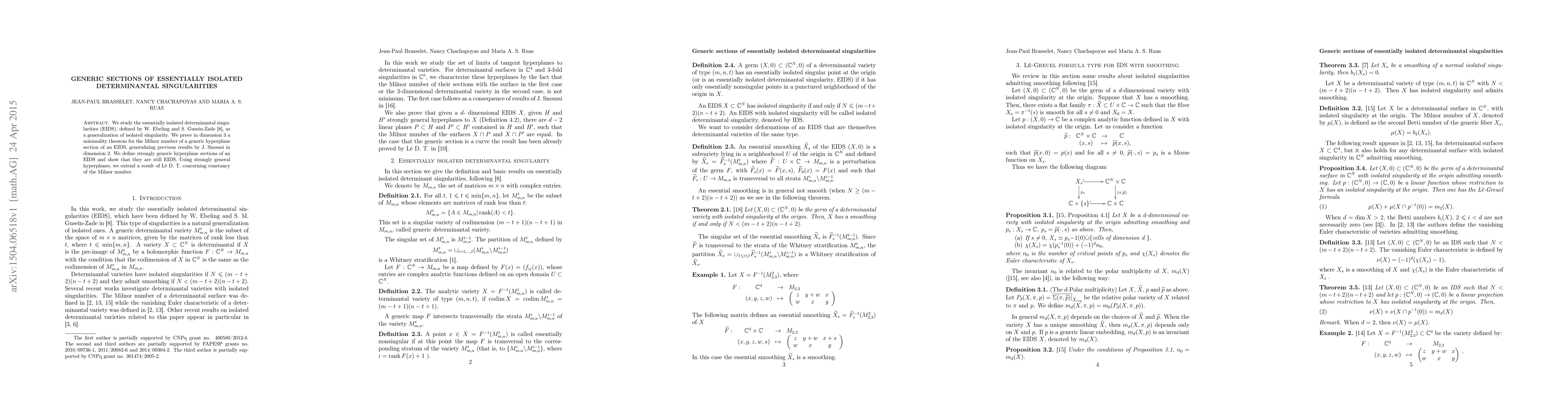 We study the essentially isolated determinantal singularities (EIDS), defined by W. Ebeling and S. Gusein-Zade, as a generalization of isolated singularity. We prove in dimension $3$ a minimality theorem for the Milnor number of a generic hyperplane section of an EIDS, generalizing previous results by J. Snoussi in dimension $2$. We define strongly generic hyperplane sections of an EIDS and show that they are still EIDS. Using strongly general hyperplanes, we extend a result of L\^e D. T. concerning constancy of the Milnor number.