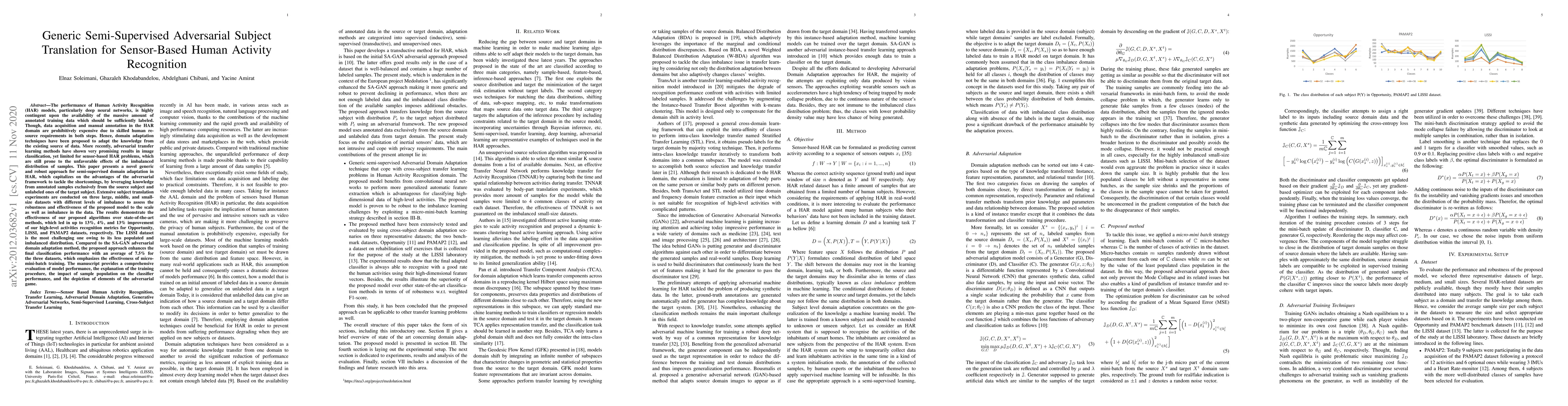 The performance of Human Activity Recognition (HAR) models, particularly deep neural networks, is highly contingent upon the availability of the massive amount of annotated training data which should be sufficiently labeled. Though, data acquisition and manual annotation in the HAR domain are prohibitively expensive due to skilled human resource requirements in both steps. Hence, domain adaptation techniques have been proposed to adapt the knowledge from the existing source of data. More recently, adversarial transfer learning methods have shown very promising results in image classification, yet limited for sensor-based HAR problems, which are still prone to the unfavorable effects of the imbalanced distribution of samples. This paper presents a novel generic and robust approach for semi-supervised domain adaptation in HAR, which capitalizes on the advantages of the adversarial framework to tackle the shortcomings, by leveraging knowledge from annotated samples exclusively from the source subject and unlabeled ones of the target subject. Extensive subject translation experiments are conducted on three large, middle, and small-size datasets with different levels of imbalance to assess the robustness and effectiveness of the proposed model to the scale as well as imbalance in the data. The results demonstrate the effectiveness of our proposed algorithms over state-of-the-art methods, which led in up to 13%, 4%, and 13% improvement of our high-level activities recognition metrics for Opportunity, LISSI, and PAMAP2 datasets, respectively. The LISSI dataset is the most challenging one owing to its less populated and imbalanced distribution. Compared to the SA-GAN adversarial domain adaptation method, the proposed approach enhances the final classification performance with an average of 7.5% for the three datasets, which emphasizes the effectiveness of micro-mini-batch training.
