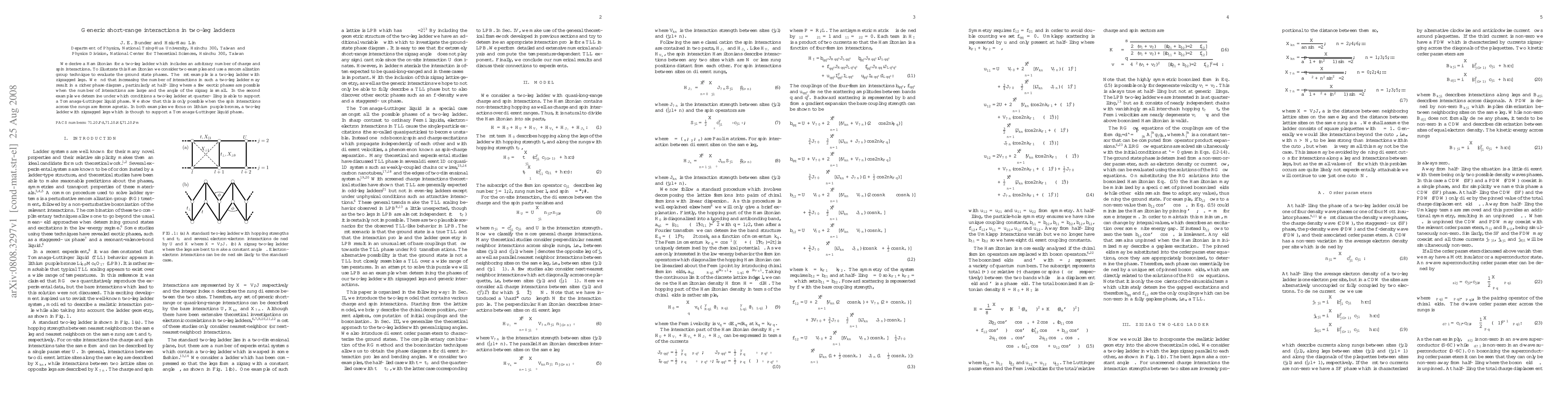 This paper derives a Hamiltonian for a two-leg ladder system with various charge and spin interactions, applying renormalization group techniques to explore ground state phases. It finds that increased interactions in zigzagged ladders can lead to exotic phases at half-filling, and that a Tomanaga-Luttinger liquid phase at quarter-filling requires ferromagnetic spin interactions across rungs.