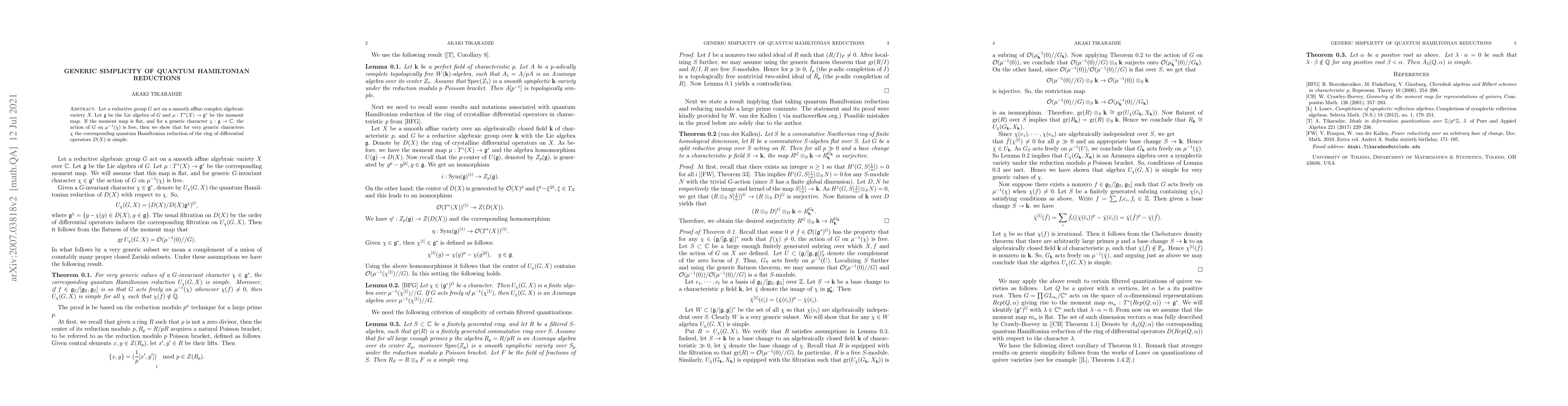 The paper shows that for very generic characters, a quantum Hamiltonian reduction of the ring of differential operators on a smooth affine variety is simple when the moment map is flat and the action of the reductive group is free.