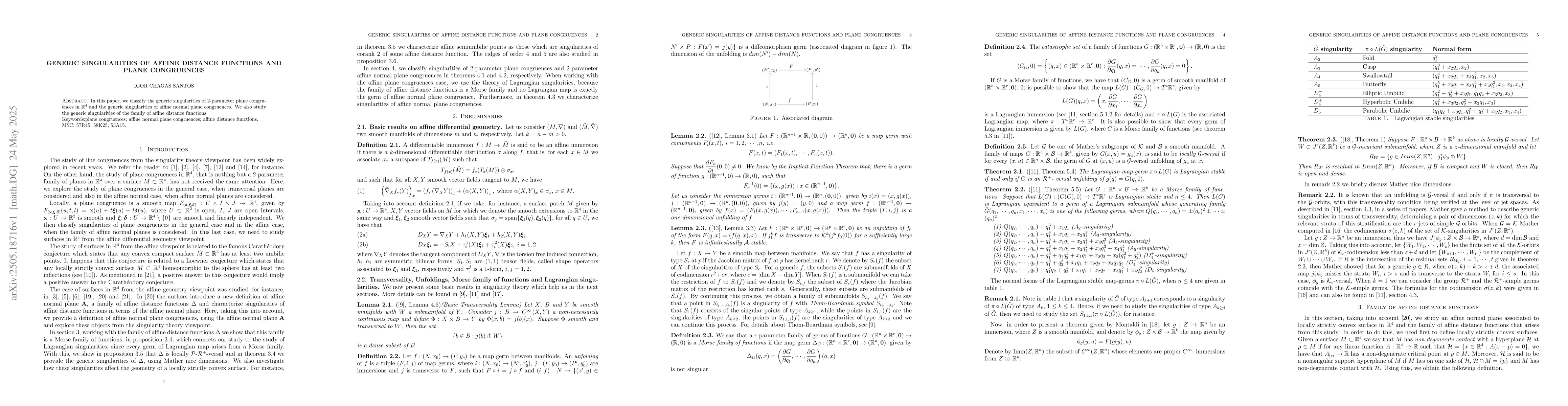 The paper presents a detailed classification of singularities for affine distance functions and plane congruences, advancing the theoretical framework in differential geometry.
