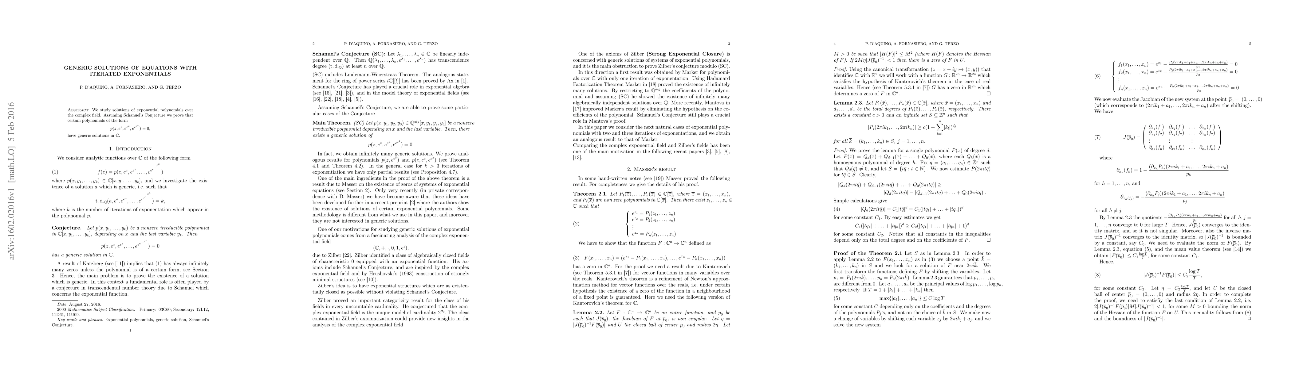 Researchers prove certain polynomials have generic solutions in the complex field under Schanuel's conjecture, advancing our understanding of exponential equations.