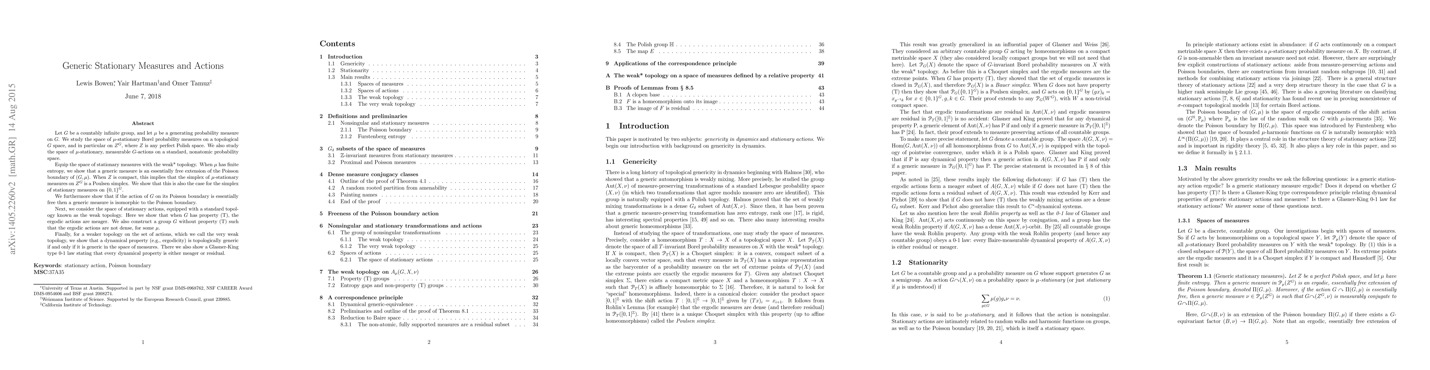 Let $G$ be a countably infinite group, and let $\mu$ be a generating probability measure on $G$. We study the space of $\mu$-stationary Borel probability measures on a topological $G$ space, and in particular on $Z^G$, where $Z$ is any perfect Polish space. We also study the space of $\mu$-stationary, measurable $G$-actions on a standard, nonatomic probability space. Equip the space of stationary measures with the weak* topology. When $\mu$ has finite entropy, we show that a generic measure is an essentially free extension of the Poisson boundary of $(G,\mu)$. When $Z$ is compact, this implies that the simplex of $\mu$-stationary measures on $Z^G$ is a Poulsen simplex. We show that this is also the case for the simplex of stationary measures on $\{0,1\}^G$. We furthermore show that if the action of $G$ on its Poisson boundary is essentially free then a generic measure is isomorphic to the Poisson boundary. Next, we consider the space of stationary actions, equipped with a standard topology known as the weak topology. Here we show that when $G$ has property (T), the ergodic actions are meager. We also construct a group $G$ without property (T) such that the ergodic actions are not dense, for some $\mu$. Finally, for a weaker topology on the set of actions, which we call the very weak topology, we show that a dynamical property (e.g., ergodicity) is topologically generic if and only if it is generic in the space of measures. There we also show a Glasner-King type 0-1 law stating that every dynamical property is either meager or residual.