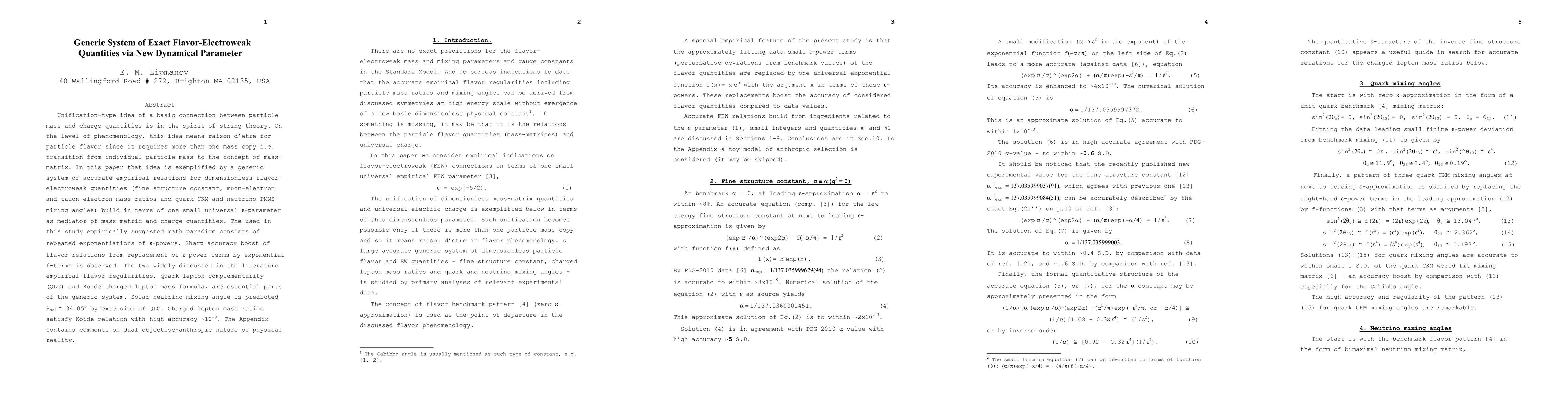 Unification-type idea of a basic connection between particle mass and charge quantities is in the spirit of string theory. On the level of phenomenology, this idea means raison d'etre for particle flavor since it requires more than one mass copy i.e. transition from individual particle mass to the concept of mass-matrix. In this paper that idea is exemplified by a generic system of accurate empirical relations for dimensionless flavor-electroweak quantities (fine structure constant, muon-electron and tauon-electron mass ratios and quark CKM and neutrino PMNS mixing angles) build in terms of one small universal e-parameter as mediator of mass-matrix and charge quantities. The used in this study empirically suggested math paradigm consists of repeated exponentiation of e-powers. Accuracy boost of flavor relations from replacement of e-power terms by exponential f-terms is observed. The two widely discussed in the literature empirical flavor regularities, quark-lepton complementarity (QLC) and Koide charged lepton mass formula, are essential parts of the generic system. Solar neutrino mixing angle is predicted {\theta}sol= 34.05o by extension of QLC. Charged lepton mass ratios satisfy Koide relation with high accuracy ~10-9. The Appendix contains comments on dual objective-anthropic nature of physical reality.