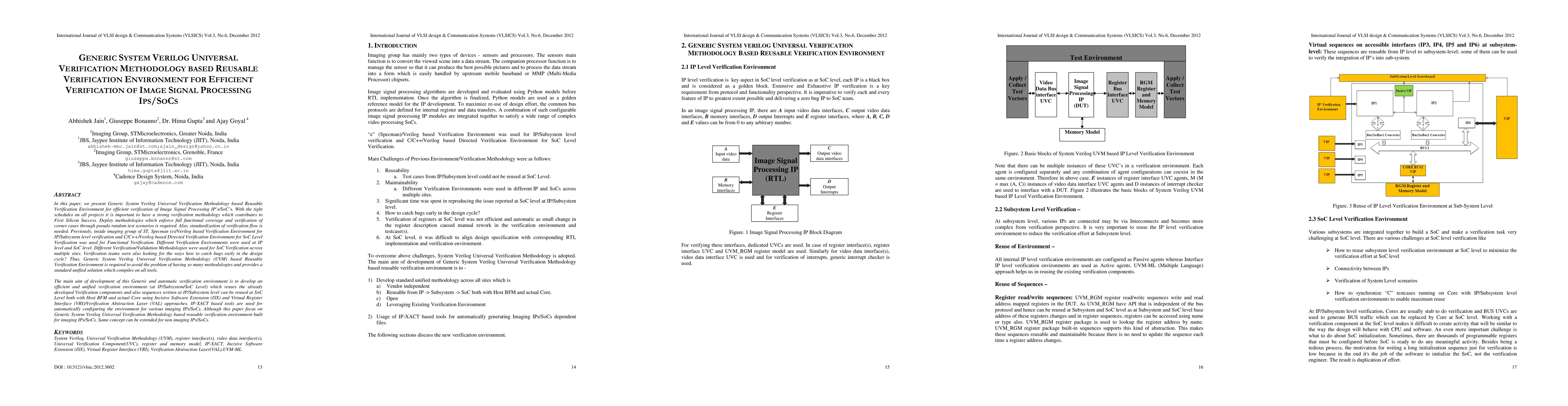 In this paper,we present Generic System Verilog Universal Verification Methodology based Reusable Verification Environment for efficient verification of Image Signal Processing IP's/SoC's. With the tight schedules on all projects it is important to have a strong verification methodology which contributes to First Silicon Success. Deploy methodologies which enforce full functional coverage and verification of corner cases through pseudo random test scenarios is required. Also, standardization of verification flow is needed. Previously, inside imaging group of ST, Specman (e)/Verilog based Verification Environment for IP/Subsystem level verification and C/C++/Verilog based Directed Verification Environment for SoC Level Verification was used for Functional Verification. Different Verification Environments were used at IP level and SoC level. Different Verification/Validation Methodologies were used for SoC Verification across multiple sites. Verification teams were also looking for the ways how to catch bugs early in the design cycle? Thus, Generic System Verilog Universal Verification Methodology (UVM) based Reusable Verification Environment is required to avoid the problem of having so many methodologies and provides a standard unified solution which compiles on all tools. The main aim of development of this Generic and automatic verification environment is to develop an efficient and unified verification environment (at IP/Subsystem/SoC Level) which reuses the already developed Verification components and also sequences written at IP/Subsystem level can be reused at SoC Level both with Host BFM and actual Core using Incisive Software Extension (ISX) and Virtual Register Interface (VRI)/Verification Abstraction Layer (VAL) approaches. IP-XACT based tools are used for automatically configuring the environment for various imaging IPs/SoCs.