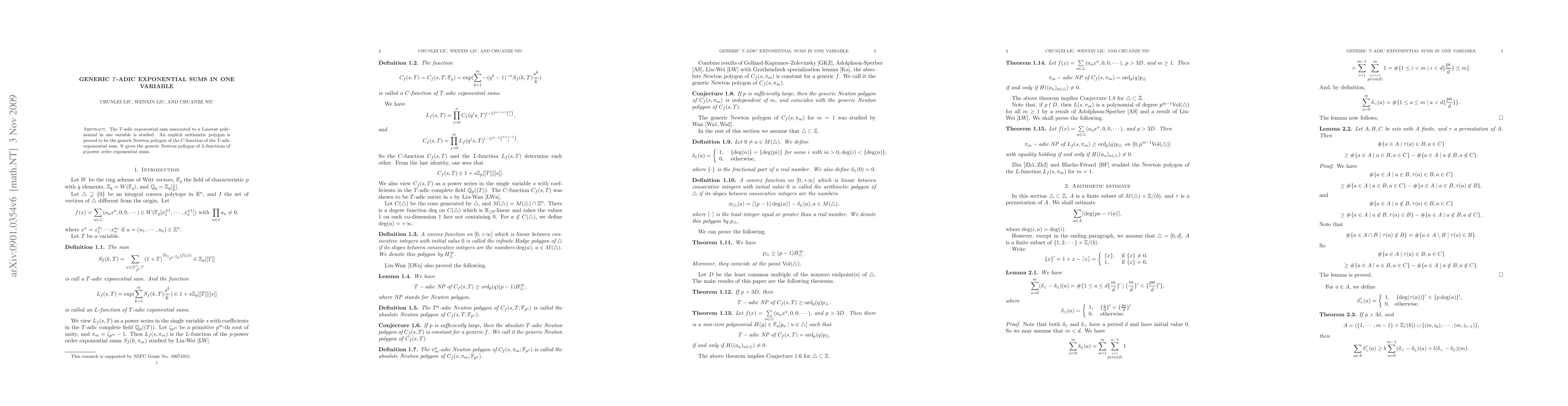 The $T$-adic exponential sum associated to a Laurent polynomial in one variable is studied. An explicit arithmetic polygon is proved to be the generic Newton polygon of the $C$-function of the T-adic exponential sum. It gives the generic Newton polygon of $L$-functions of $p$-power order exponential sums.
