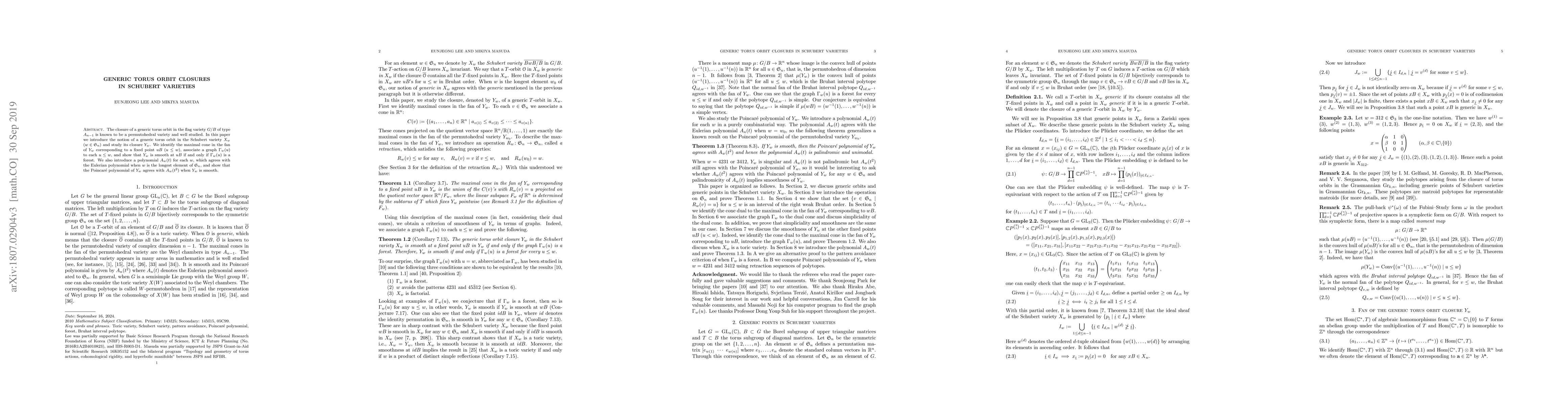 This paper studies the closure of a generic torus orbit in Schubert varieties $X_w$, identifying maximal cones in their fans and associating graphs $\Gamma_w(u)$ that determine smoothness. It introduces a polynomial $A_w(t)$ that aligns with the Eulerian polynomial for the longest element and relates the Poincaré polynomial of $Y_w$ to $A_w(t^2)$ when $Y_w$ is smooth.