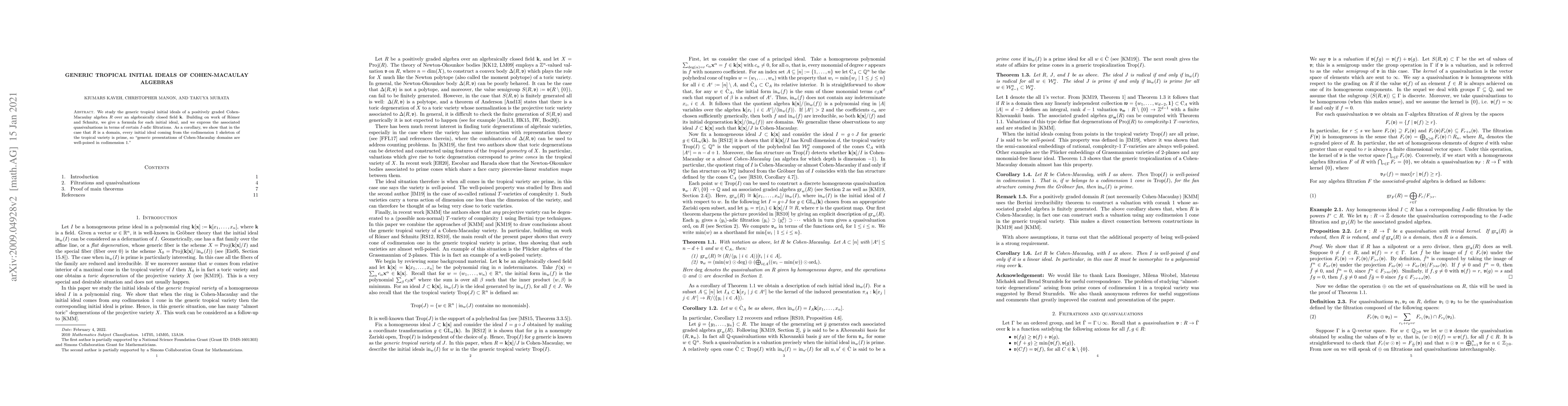 The paper studies the generic tropical initial ideals of Cohen-Macaulay algebras, providing a formula for each ideal and expressing associated quasivaluations in terms of certain I-adic filtrations.