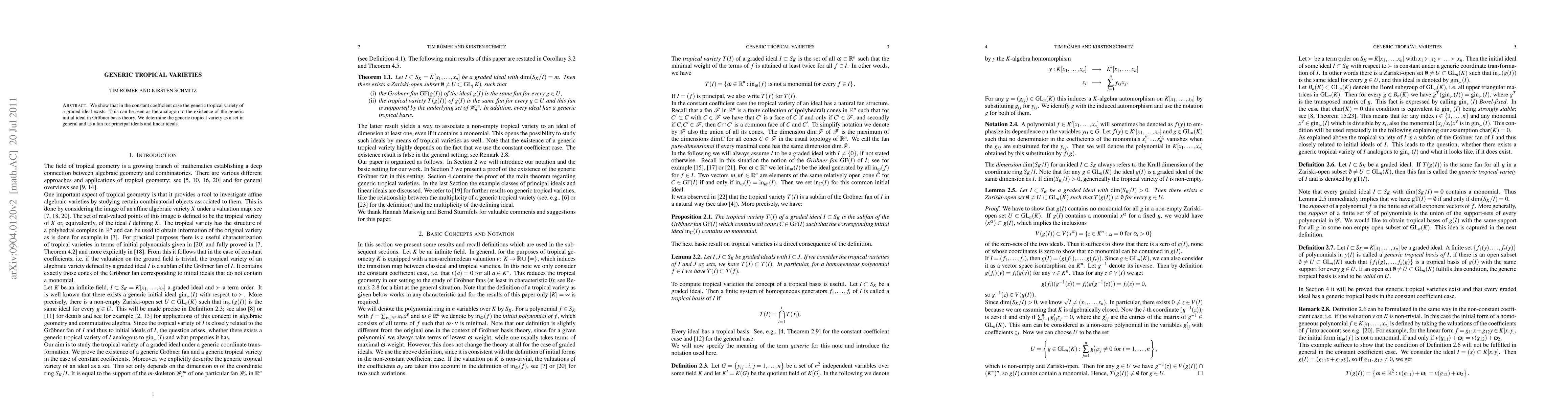 This research proves the existence of generic tropical varieties for graded ideals with constant coefficients, akin to generic initial ideals in Groebner basis theory. It identifies these varieties both as sets and as fans for principal and linear ideals.