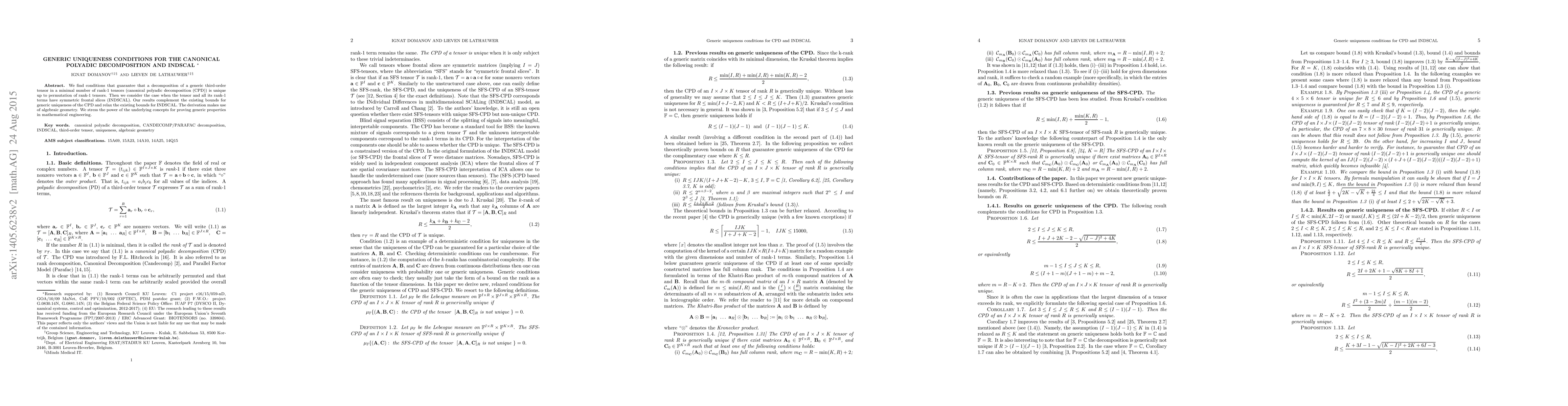The research derives conditions for the generic uniqueness of the Canonical Polyadic Decomposition (CPD) and INDSCAL, utilizing algebraic geometry techniques.