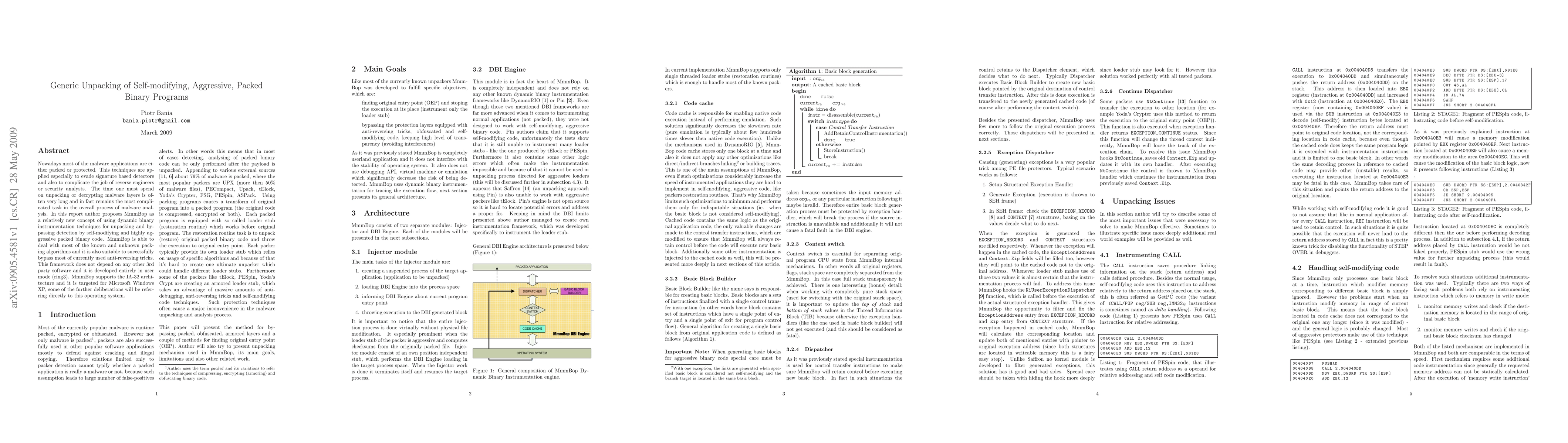 This paper introduces MmmBop, a dynamic binary instrumentation framework for unpacking self-modifying and aggressive packed malware, aiming to simplify reverse engineering and bypass anti-reversing techniques without relying on third-party software. It focuses on the IA-32 architecture for Microsoft Windows XP.