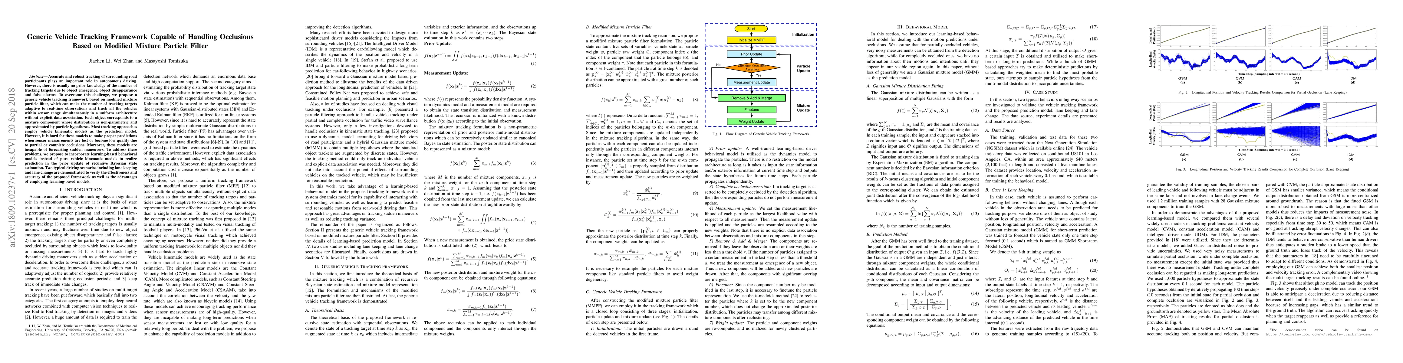 Accurate and robust tracking of surrounding road participants plays an important role in autonomous driving. However, there is usually no prior knowledge of the number of tracking targets due to object emergence, object disappearance and false alarms. To overcome this challenge, we propose a generic vehicle tracking framework based on modified mixture particle filter, which can make the number of tracking targets adaptive to real-time observations and track all the vehicles within sensor range simultaneously in a uniform architecture without explicit data association. Each object corresponds to a mixture component whose distribution is non-parametric and approximated by particle hypotheses. Most tracking approaches employ vehicle kinematic models as the prediction model. However, it is hard for these models to make proper predictions when sensor measurements are lost or become low quality due to partial or complete occlusions. Moreover, these models are incapable of forecasting sudden maneuvers. To address these problems, we propose to incorporate learning-based behavioral models instead of pure vehicle kinematic models to realize prediction in the prior update of recursive Bayesian state estimation. Two typical driving scenarios including lane keeping and lane change are demonstrated to verify the effectiveness and accuracy of the proposed framework as well as the advantages of employing learning-based models.