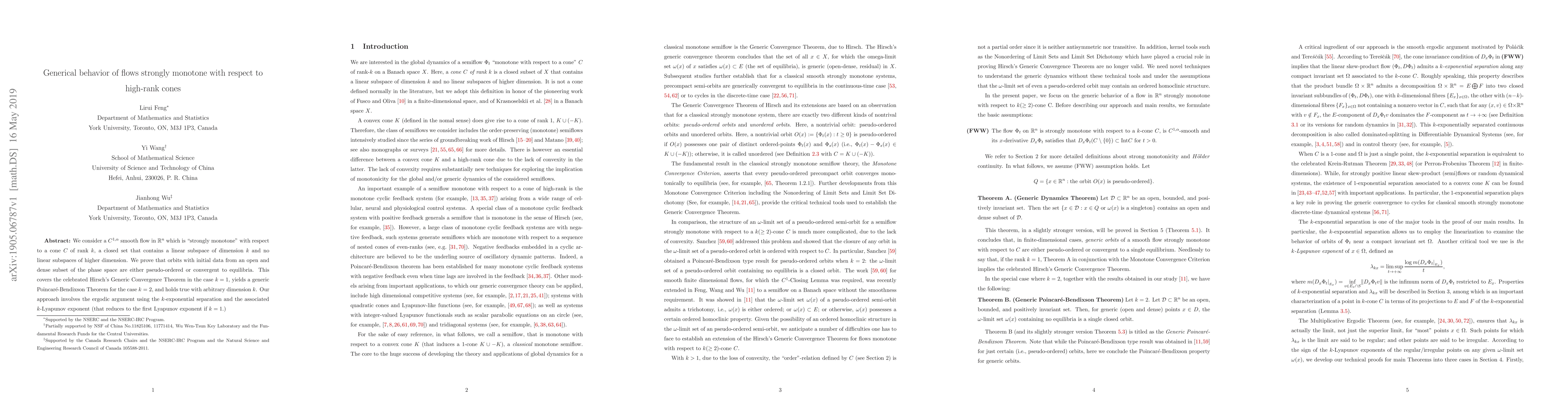 We consider a $C^{1,\alpha}$ smooth flow in $\mathbb{R}^n$ which is "strongly monotone" with respect to a cone $C$ of rank $k$, a closed set that contains a linear subspace of dimension $k$ and no linear subspaces of higher dimension. We prove that orbits with initial data from an open and dense subset of the phase space are either pseudo-ordered or convergent to equilibria. This covers the celebrated Hirsch's Generic Convergence Theorem in the case $k=1$, yields a generic Poincar\'{e}-Bendixson Theorem for the case $k=2$, and holds true with arbitrary dimension $k$. Our approach involves the ergodic argument using the $k$-exponential separation and the associated $k$-Lyapunov exponent (that reduces to the first Lyapunov exponent if $k=1$).