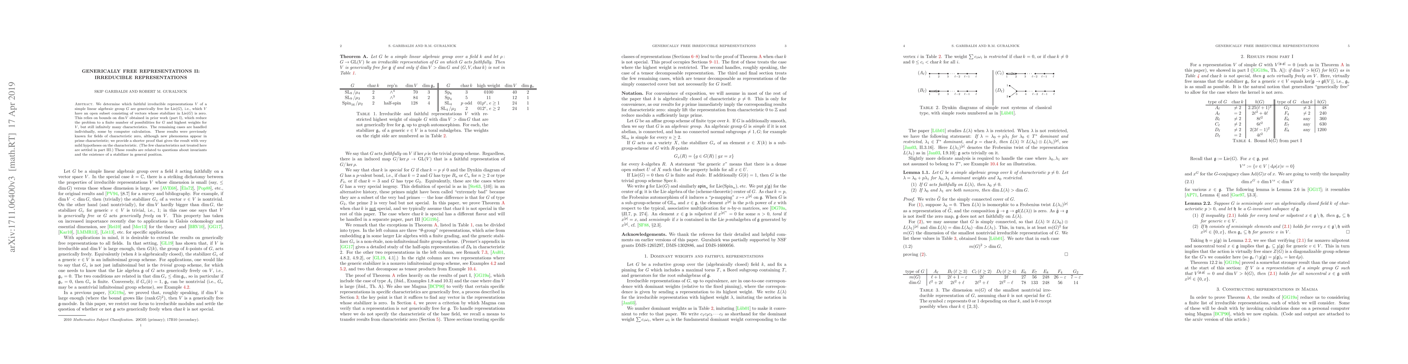 We determine which faithful irreducible representations $V$ of a simple linear algebraic group $G$ are generically free for Lie($G$), i.e., which $V$ have an open subset consisting of vectors whose stabilizer in Lie($G$) is zero. This relies on bounds on $\dim V$ obtained in prior work (part I), which reduce the problem to a finite number of possibilities for $G$ and highest weights for $V$, but still infinitely many characteristics. The remaining cases are handled individually, some by computer calculation. These results were previously known for fields of characteristic zero, although new phenomena appear in prime characteristic; we provide a shorter proof that gives the result with very mild hypotheses on the characteristic. (The few characteristics not treated here are settled in part III.) These results are related to questions about invariants and the existence of a stabilizer in general position.