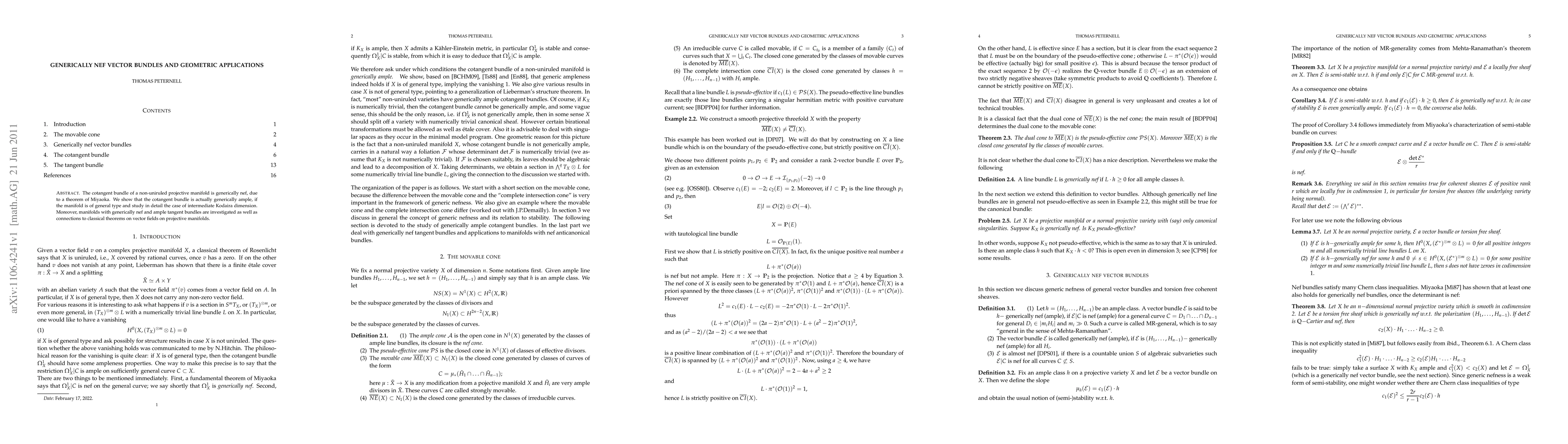 This paper explores the properties of generically nef vector bundles on projective manifolds, proving that the cotangent bundle is generically ample for manifolds of general type, and investigates tangent bundles of intermediate Kodaira dimension, alongside their geometric applications and links to classical theorems on vector fields.