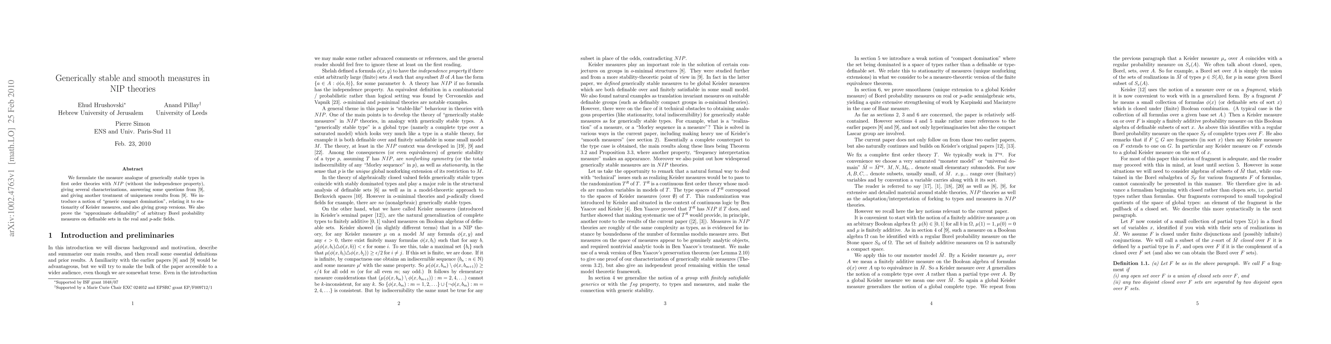 The paper introduces generically stable measures in NIP theories, characterizing them and proving their ubiquity. It also discusses generic compact domination and proves the approximate definability of arbitrary Borel probability measures on definable sets in real and p-adic fields.