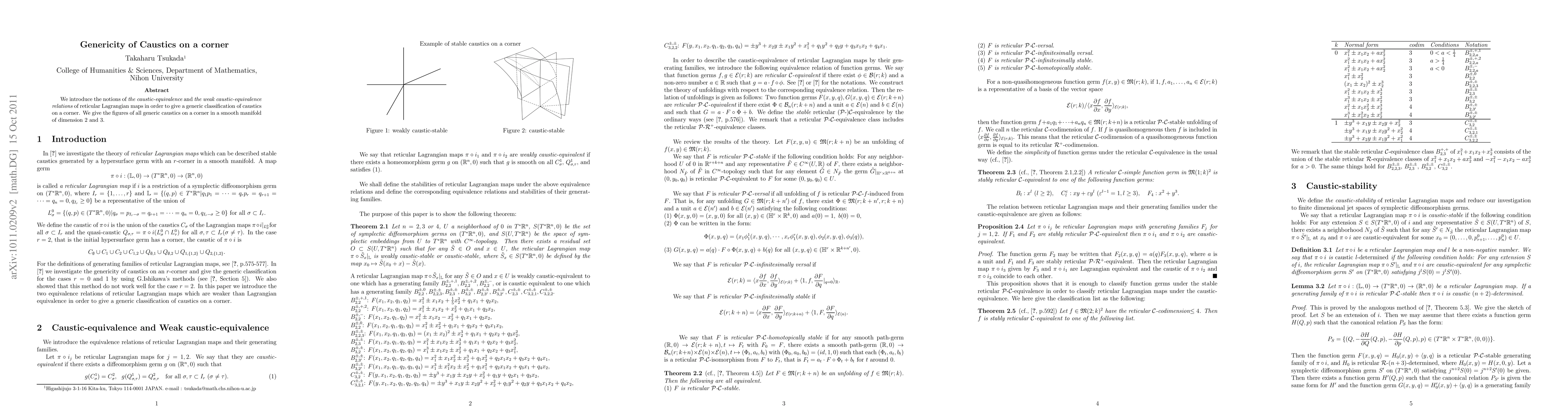 This paper introduces a generic classification of caustics on a corner, defining relations for equivalent caustic shapes in smooth manifolds of dimensions 2 and 3.