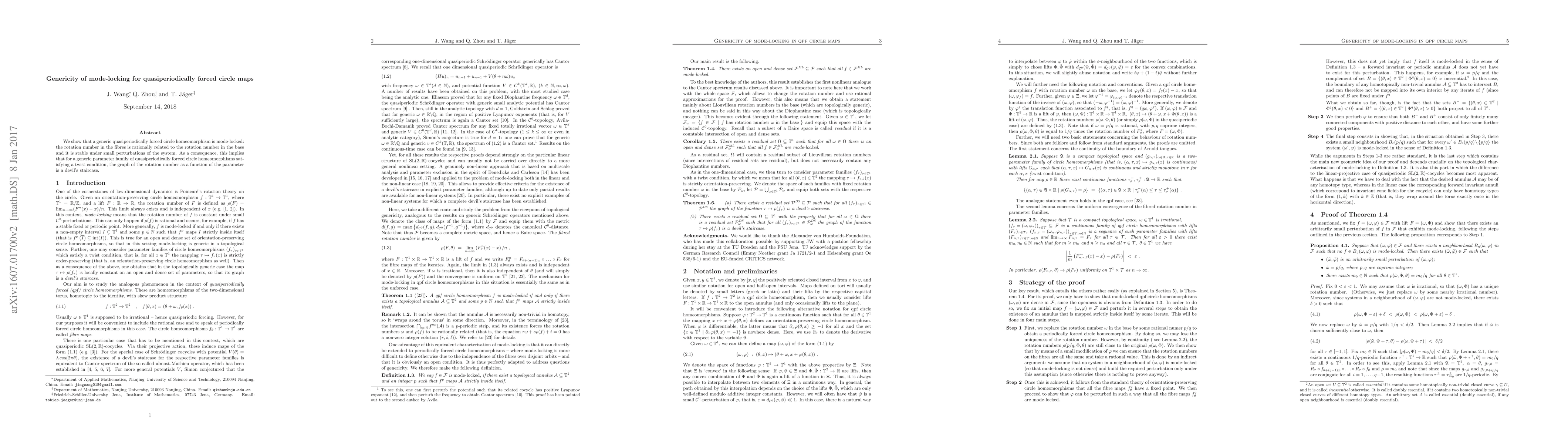 This paper demonstrates that quasiperiodically forced circle homeomorphisms are generically mode-locked, meaning their rotation numbers are rationally related and stable under small perturbations. Consequently, the rotation number graph for such systems forms a devil's staircase.
