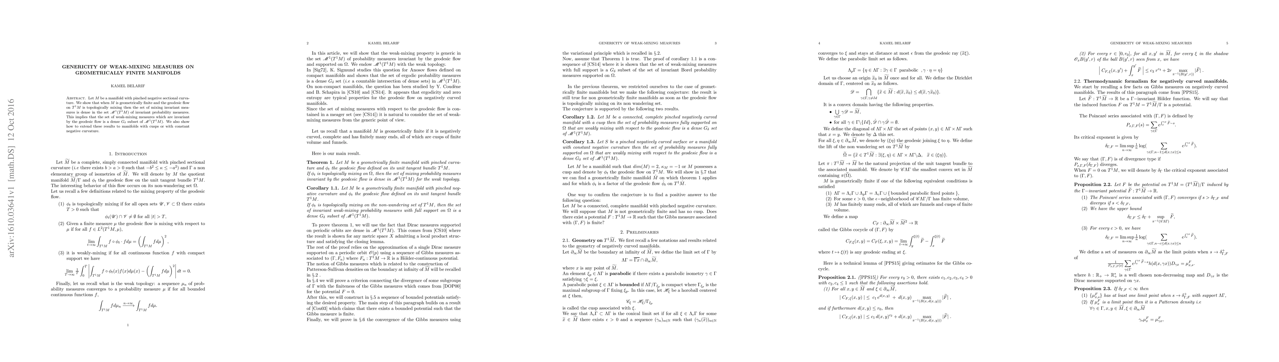 This paper demonstrates that on geometrically finite manifolds with pinched negative sectional curvature, the set of weak-mixing invariant measures under the geodesic flow is dense in the space of invariant probability measures. It further establishes that these weak-mixing measures form a dense $G_{\delta}$ subset, extending the findings to manifolds with cusps or constant negative curvature.