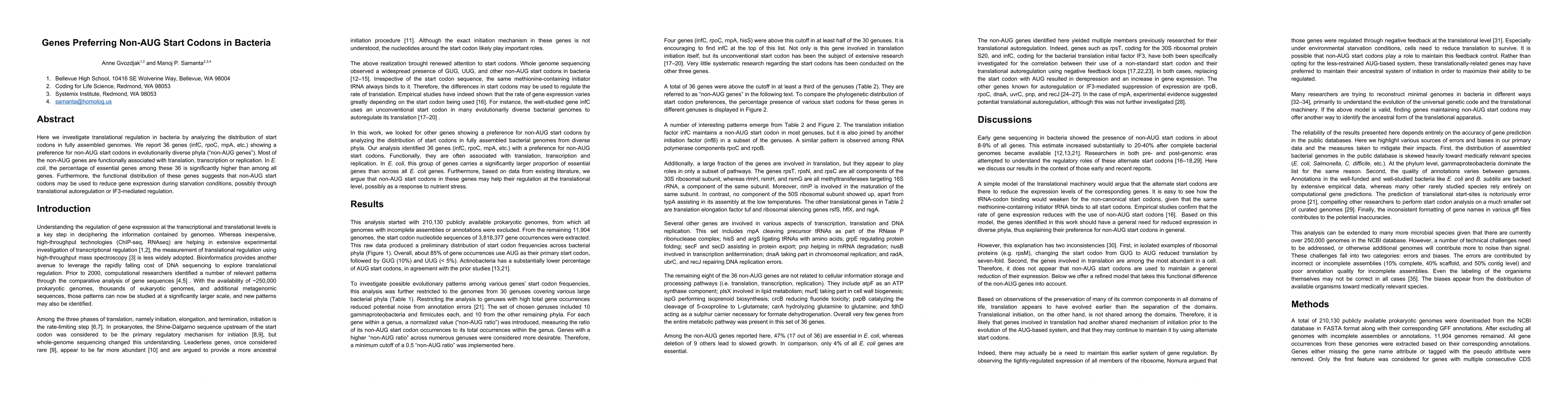 Here we investigate translational regulation in bacteria by analyzing the distribution of start codons in fully assembled genomes. We report 36 genes (infC, rpoC, rnpA, etc.) showing a preference for non-AUG start codons in evolutionarily diverse phyla ("non-AUG genes"). Most of the non-AUG genes are functionally associated with translation, transcription or replication. In E. coli, the percentage of essential genes among these 36 is significantly higher than among all genes. Furthermore, the functional distribution of these genes suggests that non-AUG start codons may be used to reduce gene expression during starvation conditions, possibly through translational autoregulation or IF3-mediated regulation.