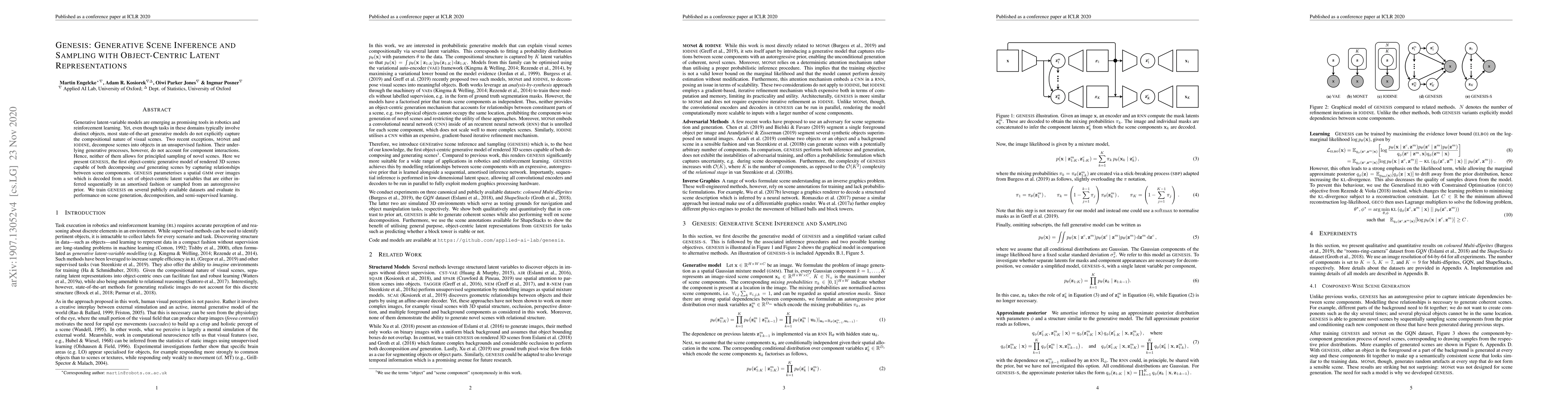 GENESIS is an innovative object-centric generative model for 3D visual scenes that decomposes and generates scenes by capturing relationships between components, addressing the limitations of previous models. It employs a spatial GMM over images decoded from object-centric latent variables, trained on multiple datasets for scene generation, decomposition, and semi-supervised learning.