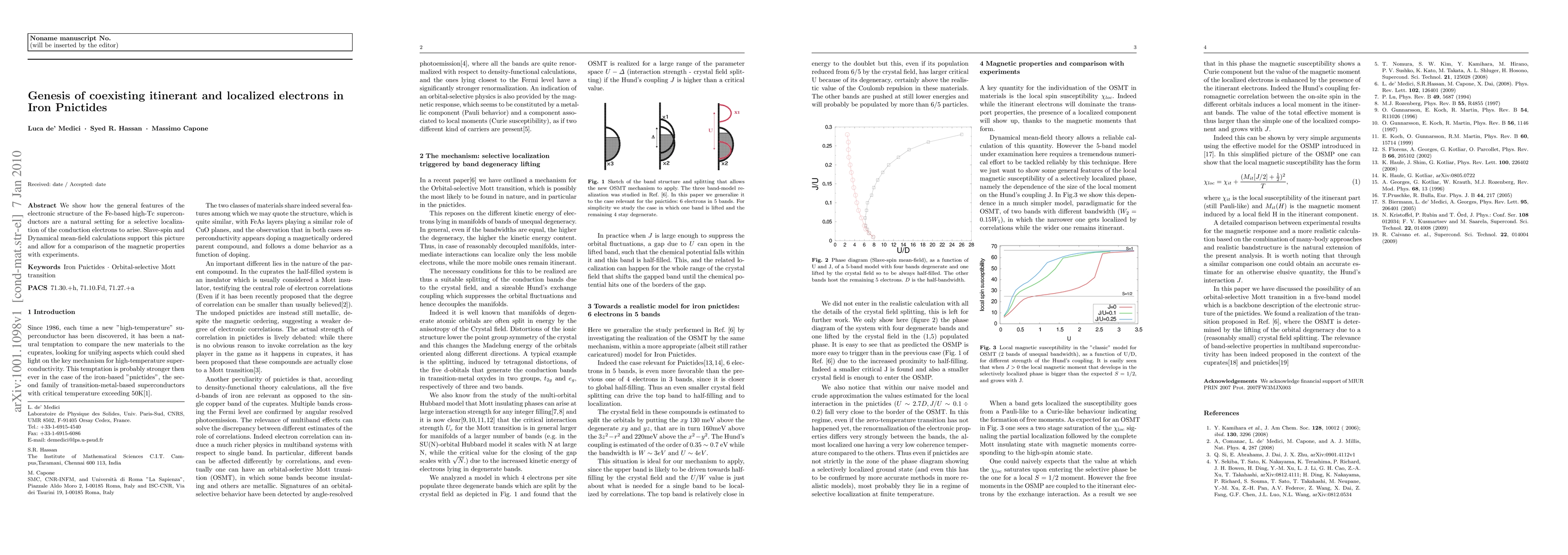 This paper explores the coexistence of itinerant and localized electrons in Fe-based high-Tc superconductors, demonstrating how their electronic structure naturally facilitates selective electron localization. Theoretical calculations using slave-spin and Dynamical mean-field methods support this model and correlate magnetic properties with experimental observations.