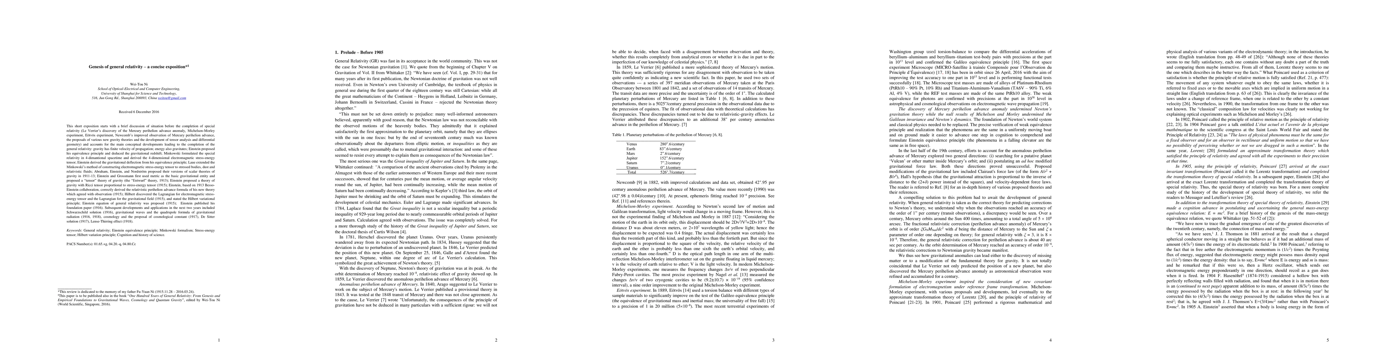 This short exposition starts with a brief discussion of situation before the completion of special relativity (Le Verrier's discovery of the Mercury perihelion advance anomaly, Michelson-Morley experiment, E\"otv\"os experiment, Newcomb's improved observation of Mercury perihelion advance, the proposals of various new gravity theories and the development of tensor analysis and differential geometry) and accounts for the main conceptual developments leading to the completion of the general relativity: gravity has finite velocity of propagation; energy also gravitates; Einstein proposed his equivalence principle and deduced the gravitational redshift; Minkowski formulated the special relativity in 4-dimantional spacetime and derived the 4-dimensional electromagnetic stress-energy tensor; Einstein derived the gravitational deflection from his equivalence principle; Laue extended the Minkowski's method of constructing electromagnetic stress-energy tensor to stressed bodies, dust and relativistic fluids; Abraham, Einstein, and Nordstr\"om proposed their versions of scalar theories of gravity in 1911-13; Einstein and Grossmann first used metric as the basic gravitational entity and proposed a "tensor" theory of gravity (the "Entwurf" theory, 1913); Einstein proposed a theory of gravity with Ricci tensor proportional to stress-energy tensor (1915); Einstein, based on 1913 Besso-Einstein collaboration, correctly derived the relativistic perihelion advance formula of his new theory which agreed with observation (1915); Hilbert discovered the Lagrangian for electromagnetic stress-energy tensor and the Lagrangian for the gravitational field (1915), and stated the Hilbert variational principle; Einstein equation of general relativity was proposed (1915); Einstein published his foundation paper (1916).