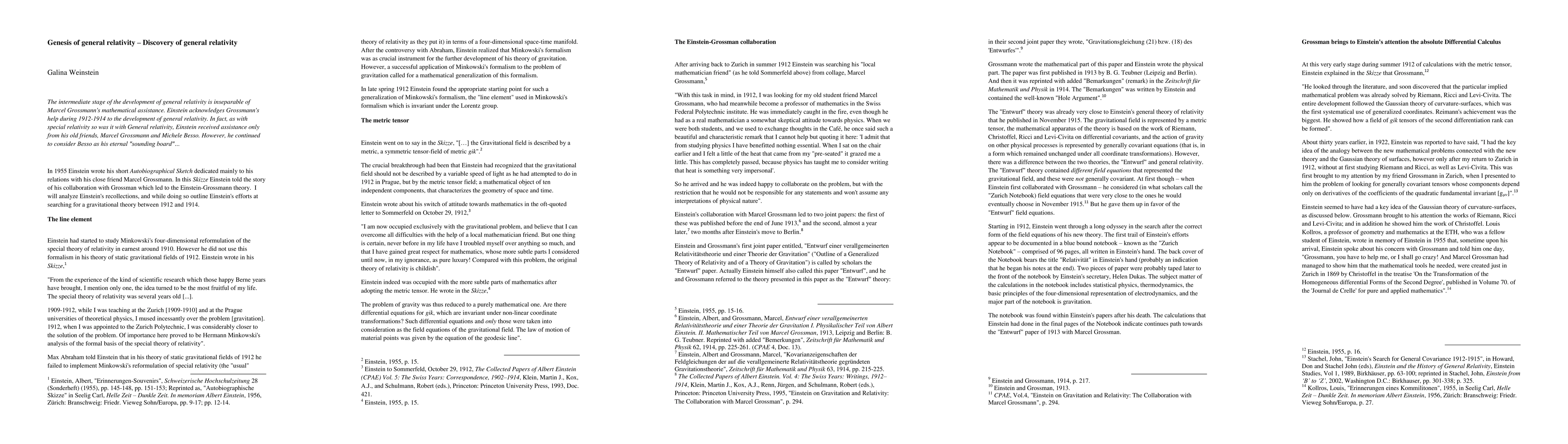 The intermediate stage of the development of general relativity is inseparable of Marcel Grossmann's mathematical assistance. Einstein acknowledges Grossmann's help during 1912-1914 to the development of general relativity. In fact, as with special relativity so was it with General relativity, Einstein received assistance only from his old friends, Marcel Grossmann and Michele Besso. However, he continued to consider Besso as his eternal "sounding board"...
