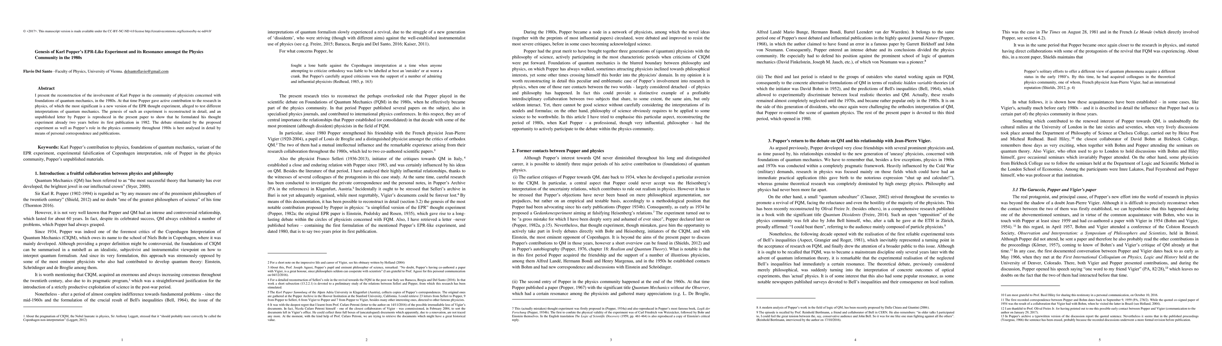 I present the reconstruction of the involvement of Karl Popper in the community of physicists concerned with foundations of quantum mechanics, in the 1980s. At that time Popper gave active contribution to the research in physics, of which the most significant is a new version of the EPR thought experiment, alleged to test different interpretations of quantum mechanics. The genesis of such an experiment is reconstructed in detail, and an unpublished letter by Popper is reproduced in the present paper to show that he formulated his thought experiment already two years before its first publication in 1982. The debate stimulated by the proposed experiment as well as Popper's role in the physics community throughout 1980s is here analysed in detail by means of personal correspondence and publications.