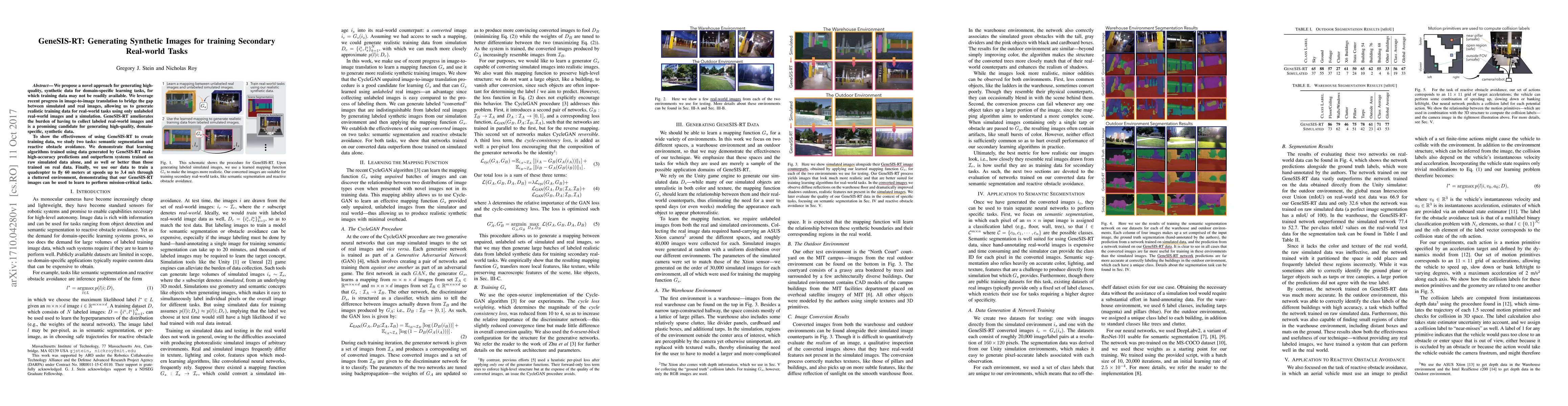 We propose a novel approach for generating high-quality, synthetic data for domain-specific learning tasks, for which training data may not be readily available. We leverage recent progress in image-to-image translation to bridge the gap between simulated and real images, allowing us to generate realistic training data for real-world tasks using only unlabeled real-world images and a simulation. GeneSIS-RT ameliorates the burden of having to collect labeled real-world images and is a promising candidate for generating high-quality, domain-specific, synthetic data. To show the effectiveness of using GeneSIS-RT to create training data, we study two tasks: semantic segmentation and reactive obstacle avoidance. We demonstrate that learning algorithms trained using data generated by GeneSIS-RT make high-accuracy predictions and outperform systems trained on raw simulated data alone, and as well or better than those trained on real data. Finally, we use our data to train a quadcopter to fly 60 meters at speeds up to 3.4 m/s through a cluttered environment, demonstrating that our GeneSIS-RT images can be used to learn to perform mission-critical tasks.