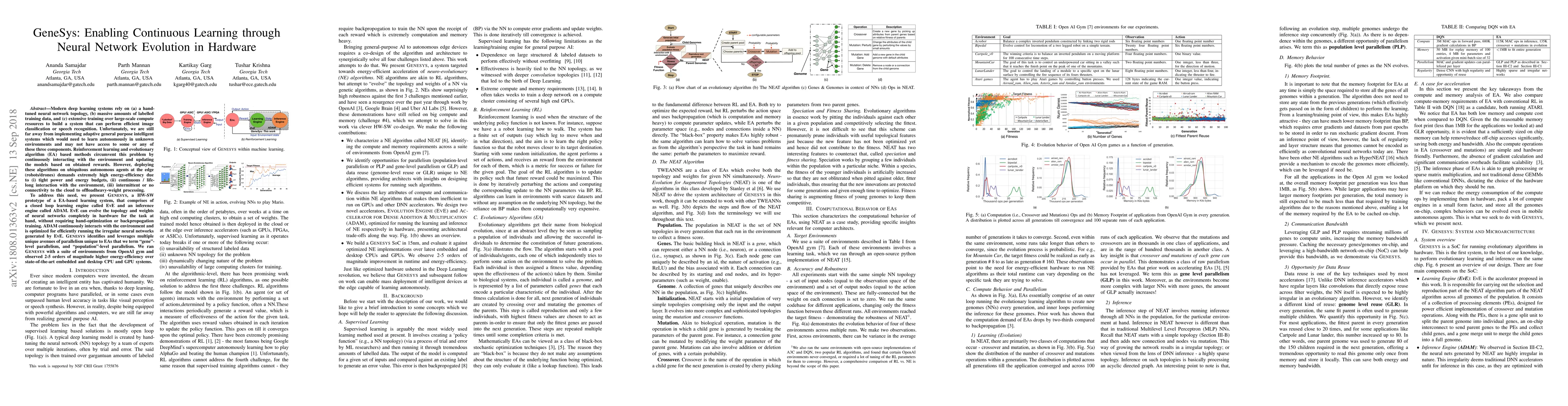 Modern deep learning systems rely on (a) a hand-tuned neural network topology, (b) massive amounts of labeled training data, and (c) extensive training over large-scale compute resources to build a system that can perform efficient image classification or speech recognition. Unfortunately, we are still far away from implementing adaptive general purpose intelligent systems which would need to learn autonomously in unknown environments and may not have access to some or any of these three components. Reinforcement learning and evolutionary algorithm (EA) based methods circumvent this problem by continuously interacting with the environment and updating the models based on obtained rewards. However, deploying these algorithms on ubiquitous autonomous agents at the edge (robots/drones) demands extremely high energy-efficiency due to (i) tight power and energy budgets, (ii) continuous/lifelong interaction with the environment, (iii) intermittent or no connectivity to the cloud to run heavy-weight processing. To address this need, we present GENESYS, an HW-SW prototype of an EA-based learning system, that comprises a closed loop learning engine called EvE and an inference engine called ADAM. EvE can evolve the topology and weights of neural networks completely in hardware for the task at hand, without requiring hand-optimization or backpropagation training. ADAM continuously interacts with the environment and is optimized for efficiently running the irregular neural networks generated by EvE. GENESYS identifies and leverages multiple unique avenues of parallelism unique to EAs that we term 'gene'- level parallelism, and 'population'-level parallelism. We ran GENESYS with a suite of environments from OpenAI gym and observed 2-5 orders of magnitude higher energy-efficiency over state-of-the-art embedded and desktop CPU and GPU systems.