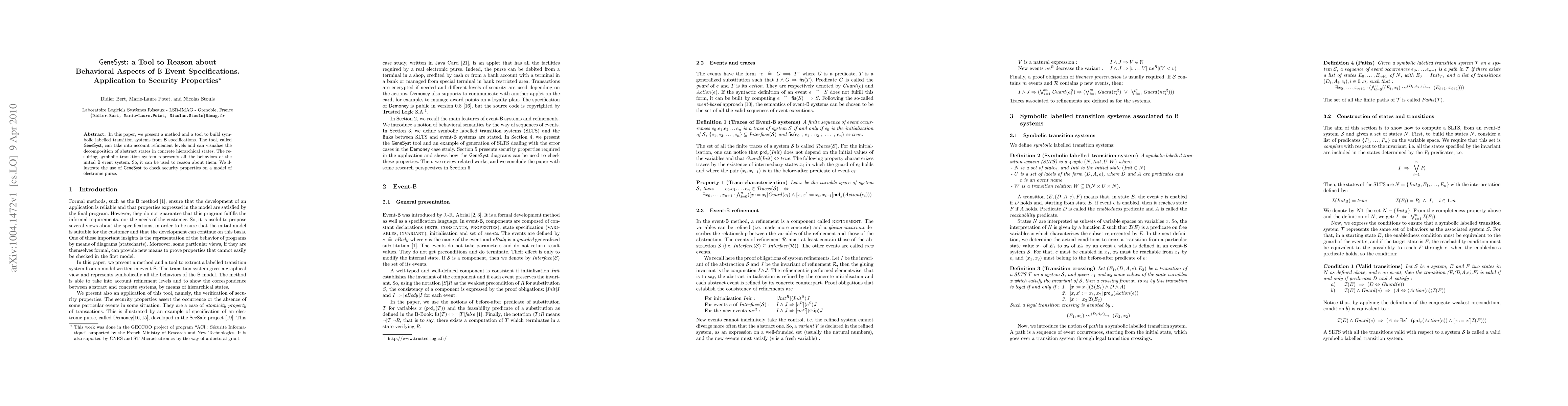 GeneSyst is a tool for constructing symbolic labelled transition systems from B specifications, enabling reasoning about behavioral aspects and security properties. It is demonstrated by checking security properties in a model of an electronic purse.