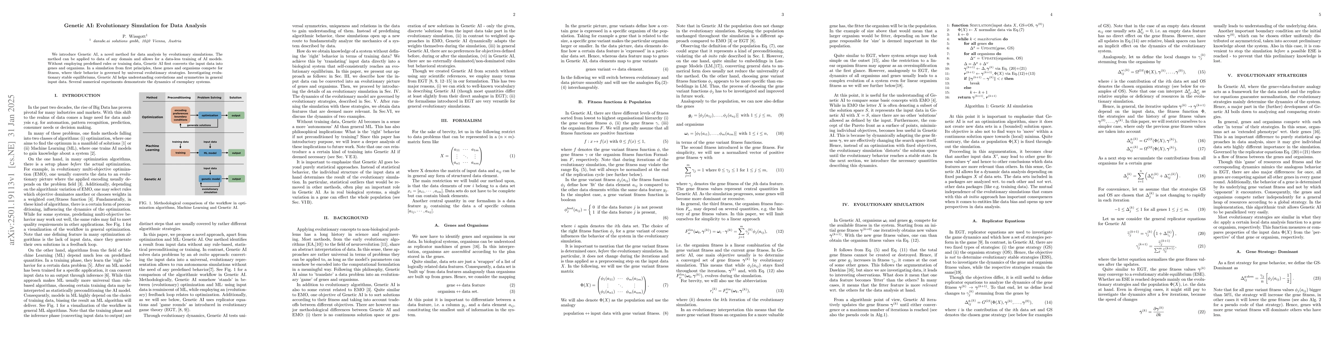 We introduce Genetic AI, a novel method for data analysis by evolutionary simulations. The method can be applied to data of any domain and allows for a data-less training of AI models. Without employing predefined rules or training data, Genetic AI first converts the input data into genes and organisms. In a simulation from first principles, these genes and organisms compete for fitness, where their behavior is governed by universal evolutionary strategies. Investigating evolutionary stable equilibriums, Genetic AI helps understanding correlations and symmetries in general input data. Several numerical experiments demonstrate the dynamics of exemplary systems.