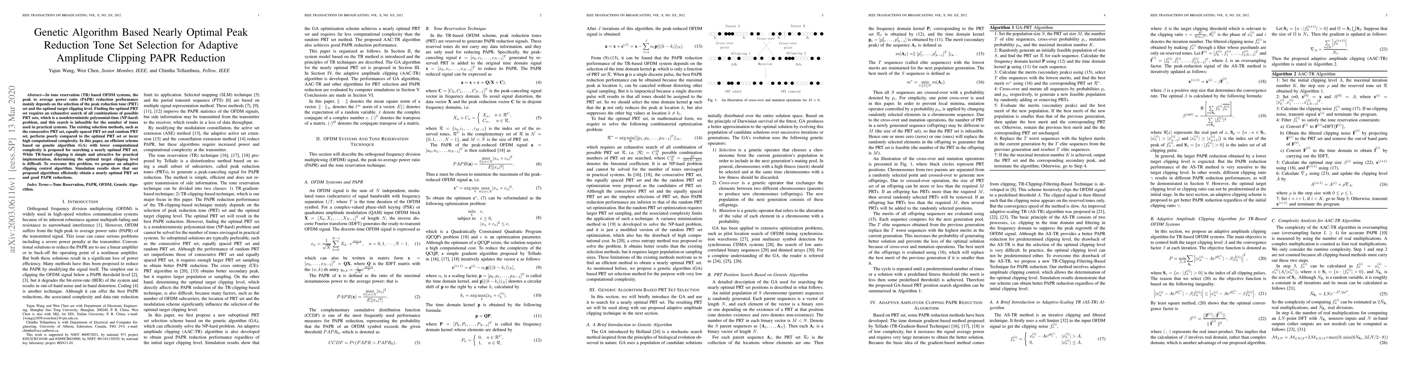 This paper proposes a genetic algorithm-based method for nearly optimal peak reduction tone set selection in tone reservation OFDM systems to reduce the peak-to-average power ratio (PAPR). The adaptive clipping control algorithm is introduced to determine the optimal clipping level, achieving efficient PAPR reduction with lower computational complexity compared to existing methods.