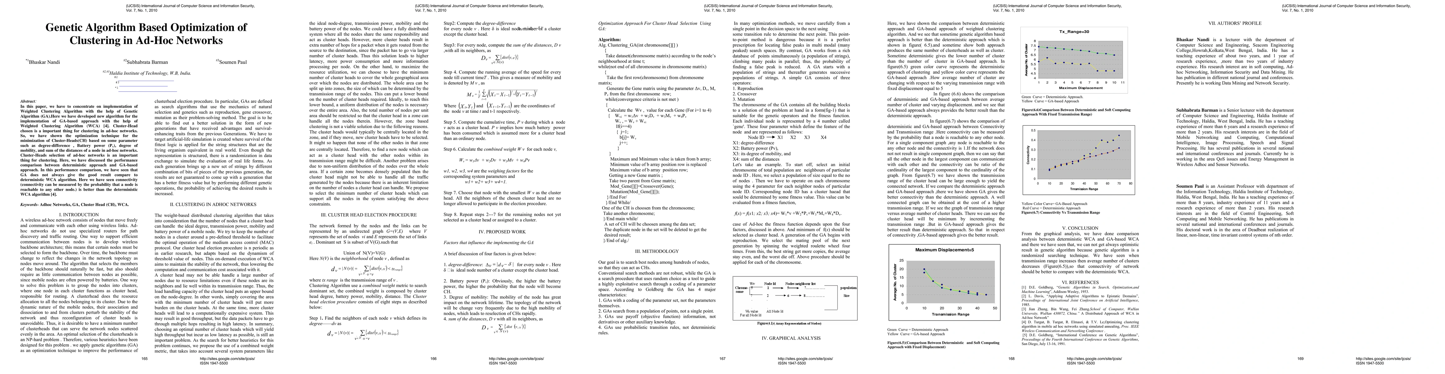 This paper presents a Genetic Algorithm (GA) based optimization for clustering in ad hoc networks using a Weighted Clustering Algorithm (WCA). The study optimizes ClusterHead selection based on parameters like degree difference, battery power, mobility, and distance, showing that while GA improves connectivity, it does not always outperform deterministic WCA.